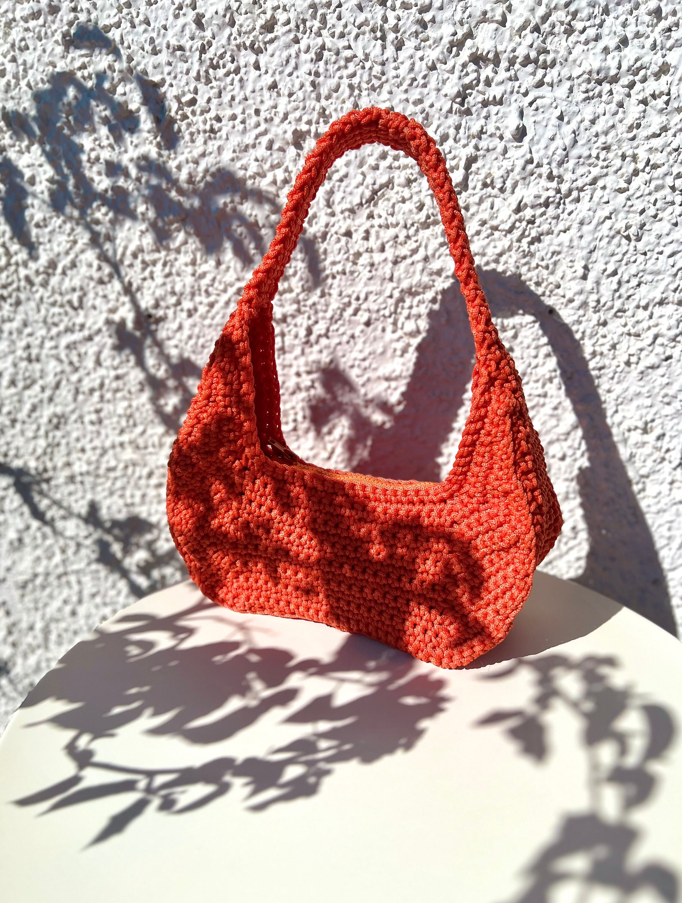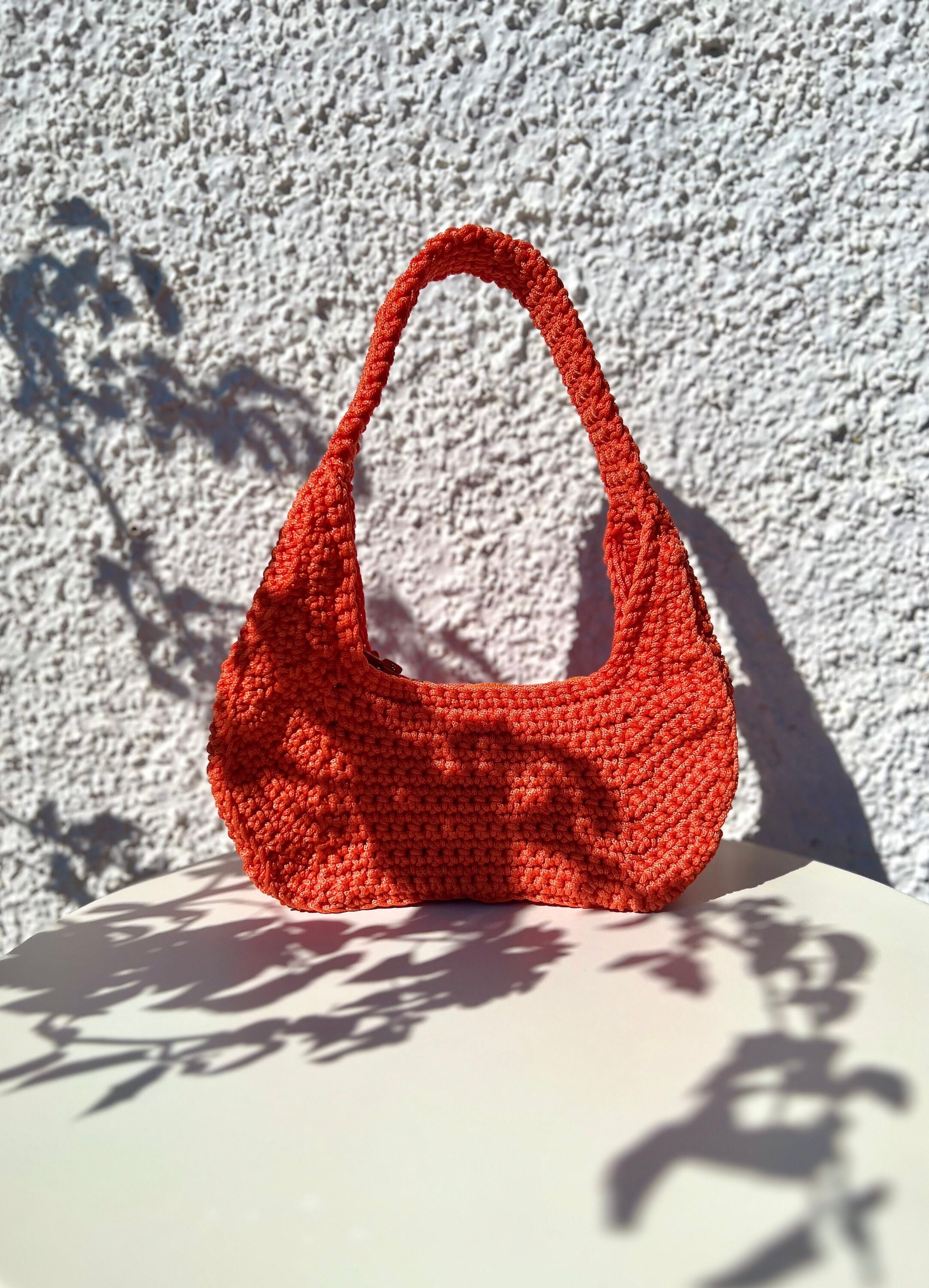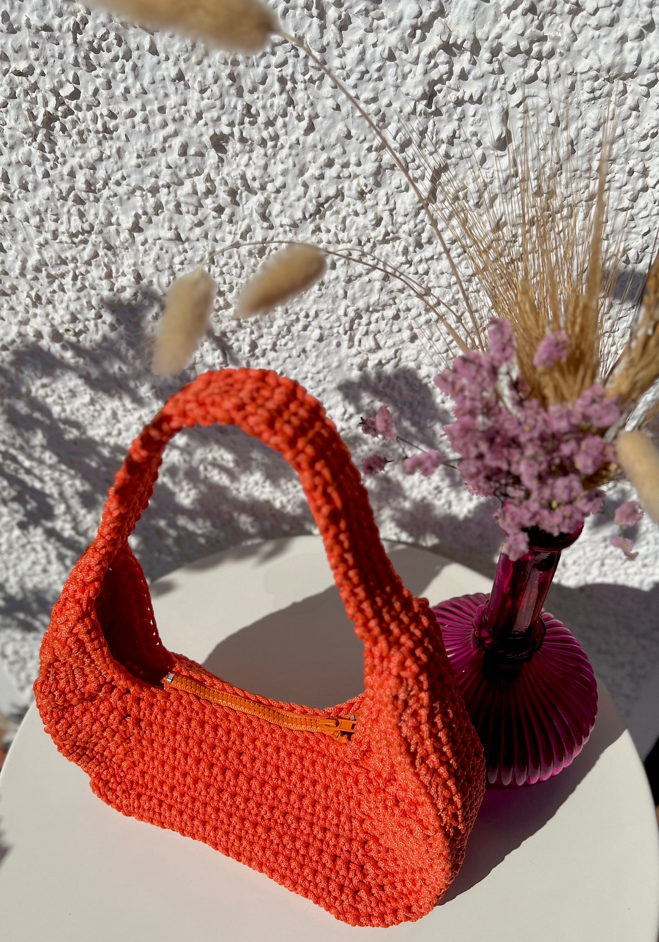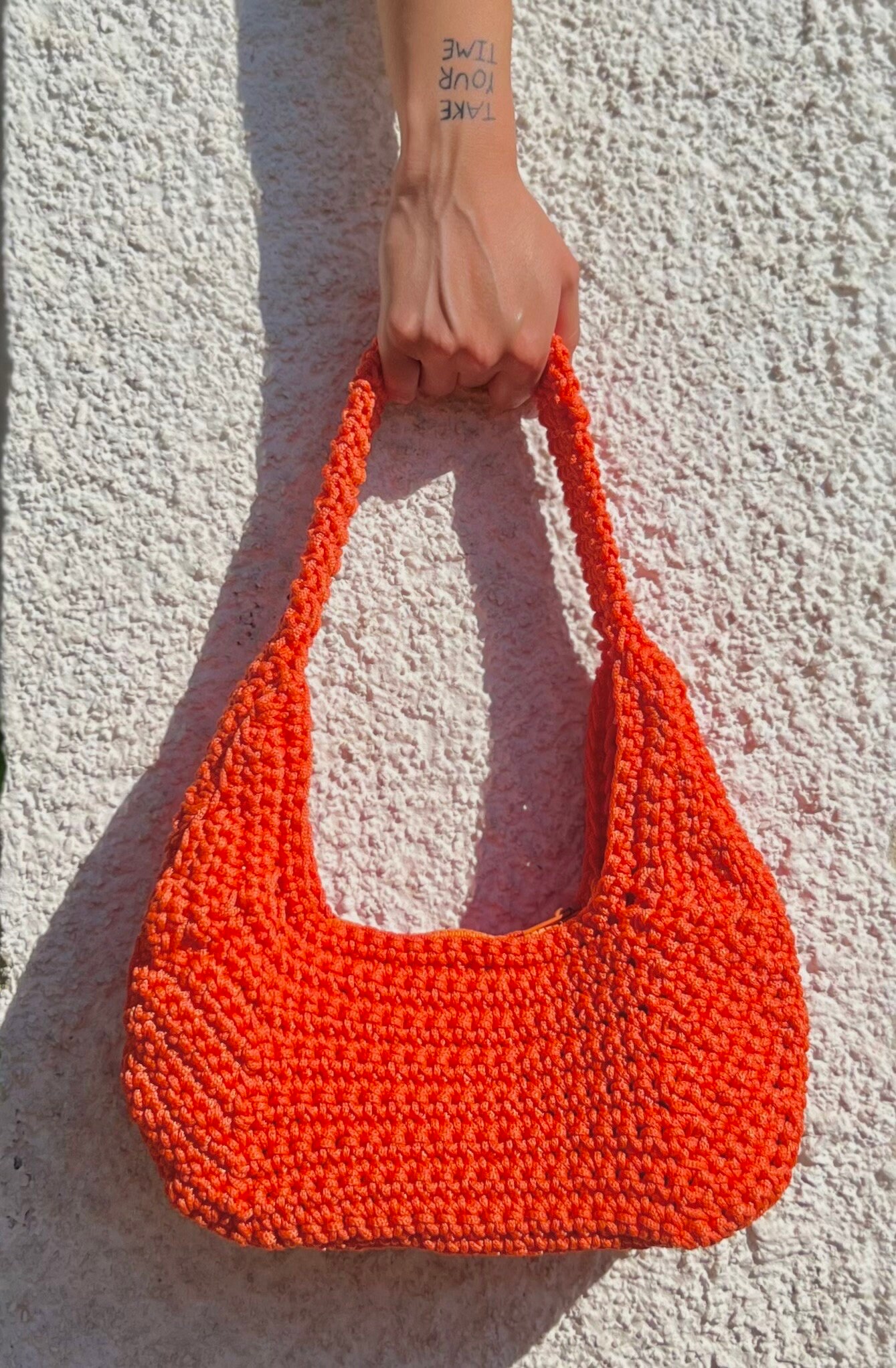 Bright shoulder bag crocheted with orange polyester thread, zip closure, convenient for everyday, perfect for evening outingsDim. h 39xL30 cm