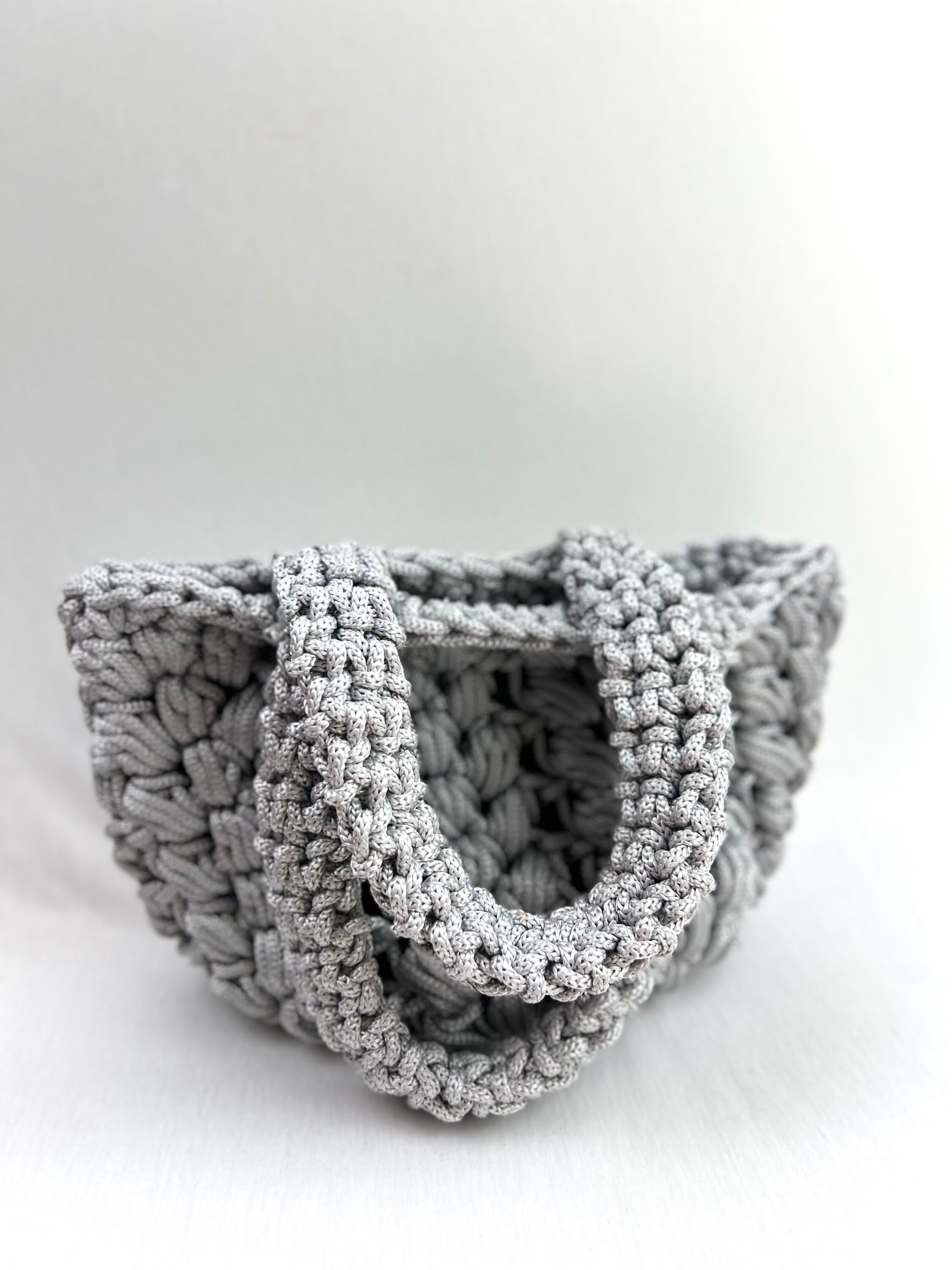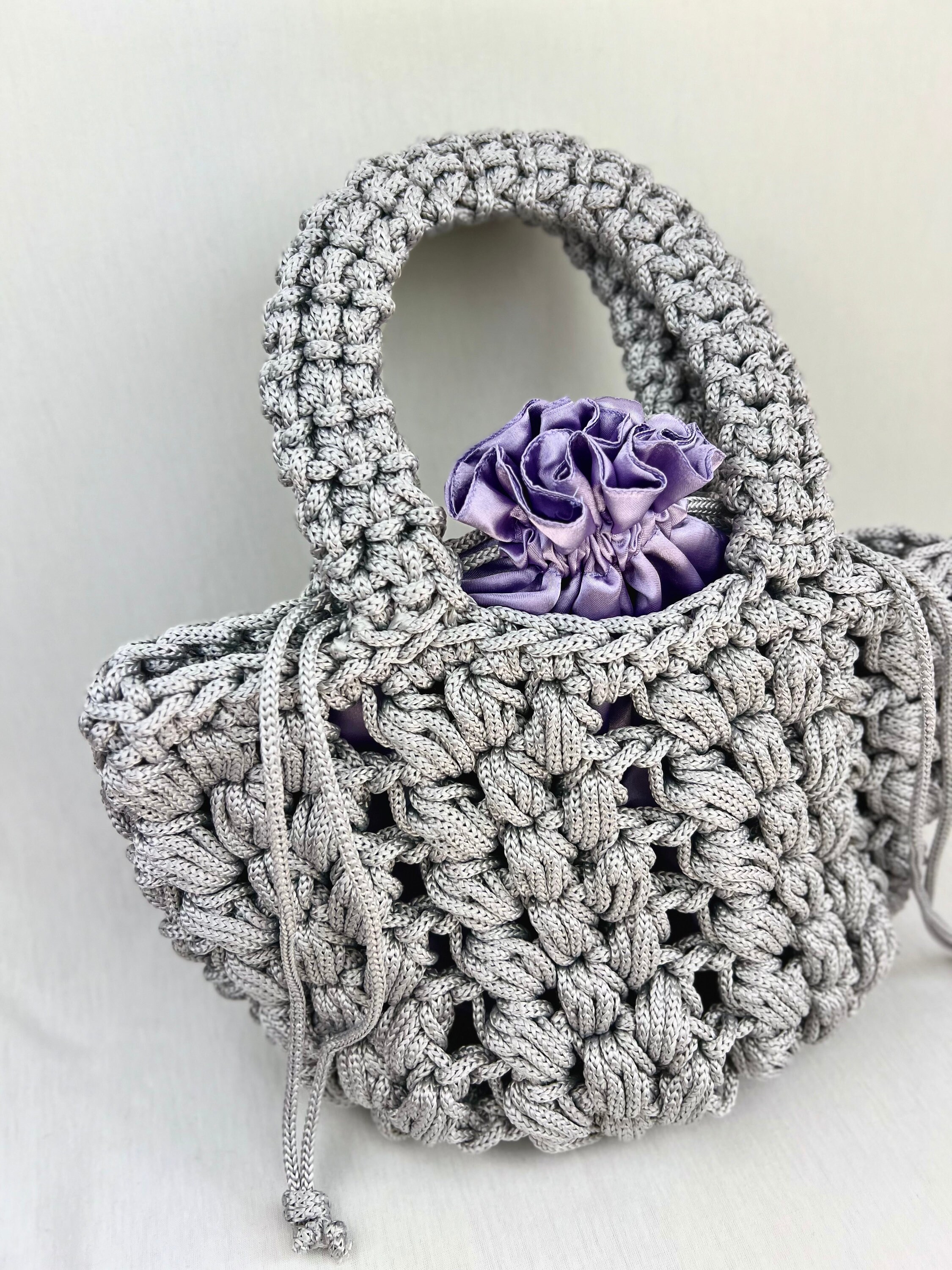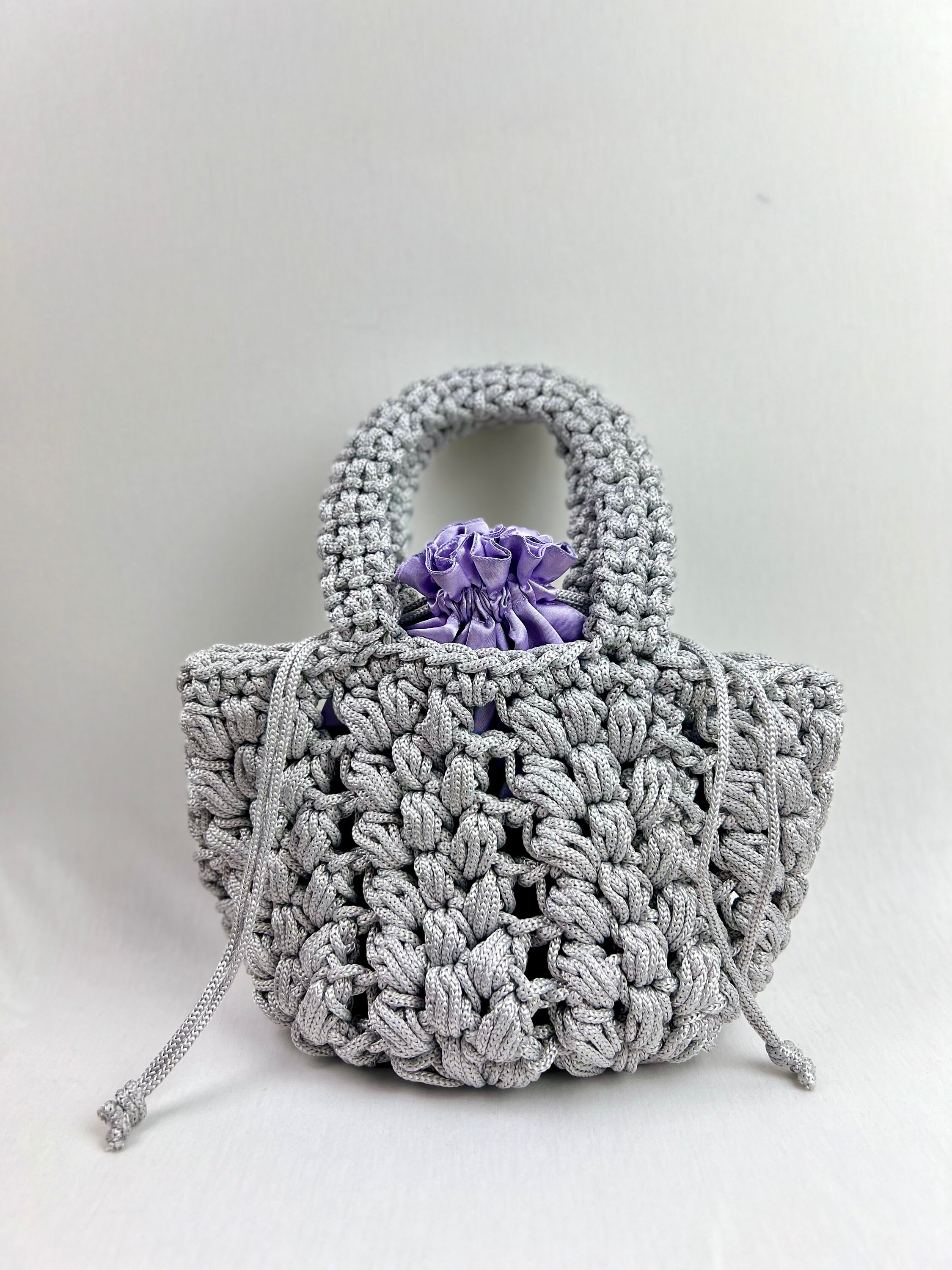 Summer bucket bag in silver color, in crocheted polyester rope with removable inner bag in lilac satin fabric, drawstring closure.Wide and sturdy handleSize H40xL28 cm