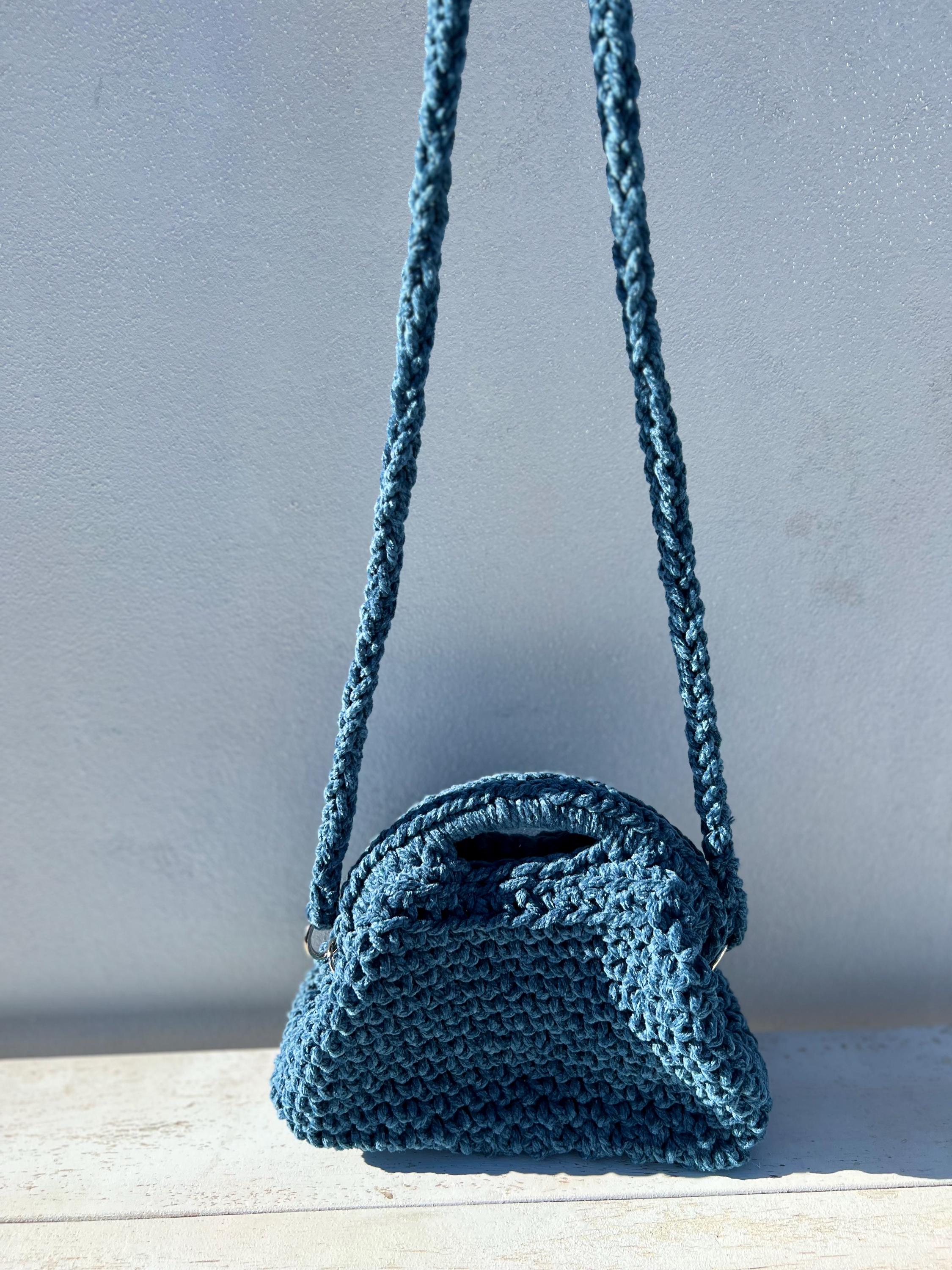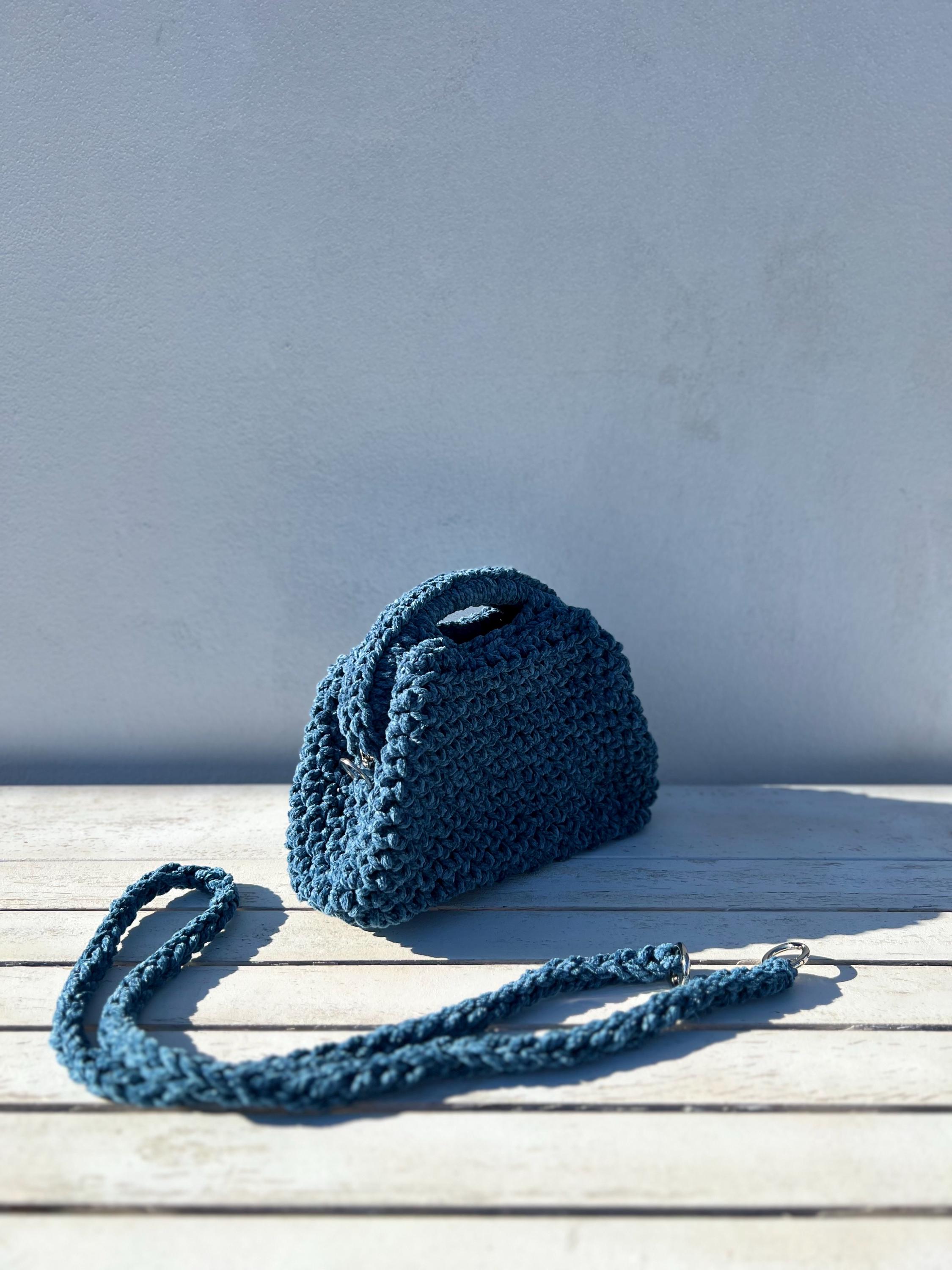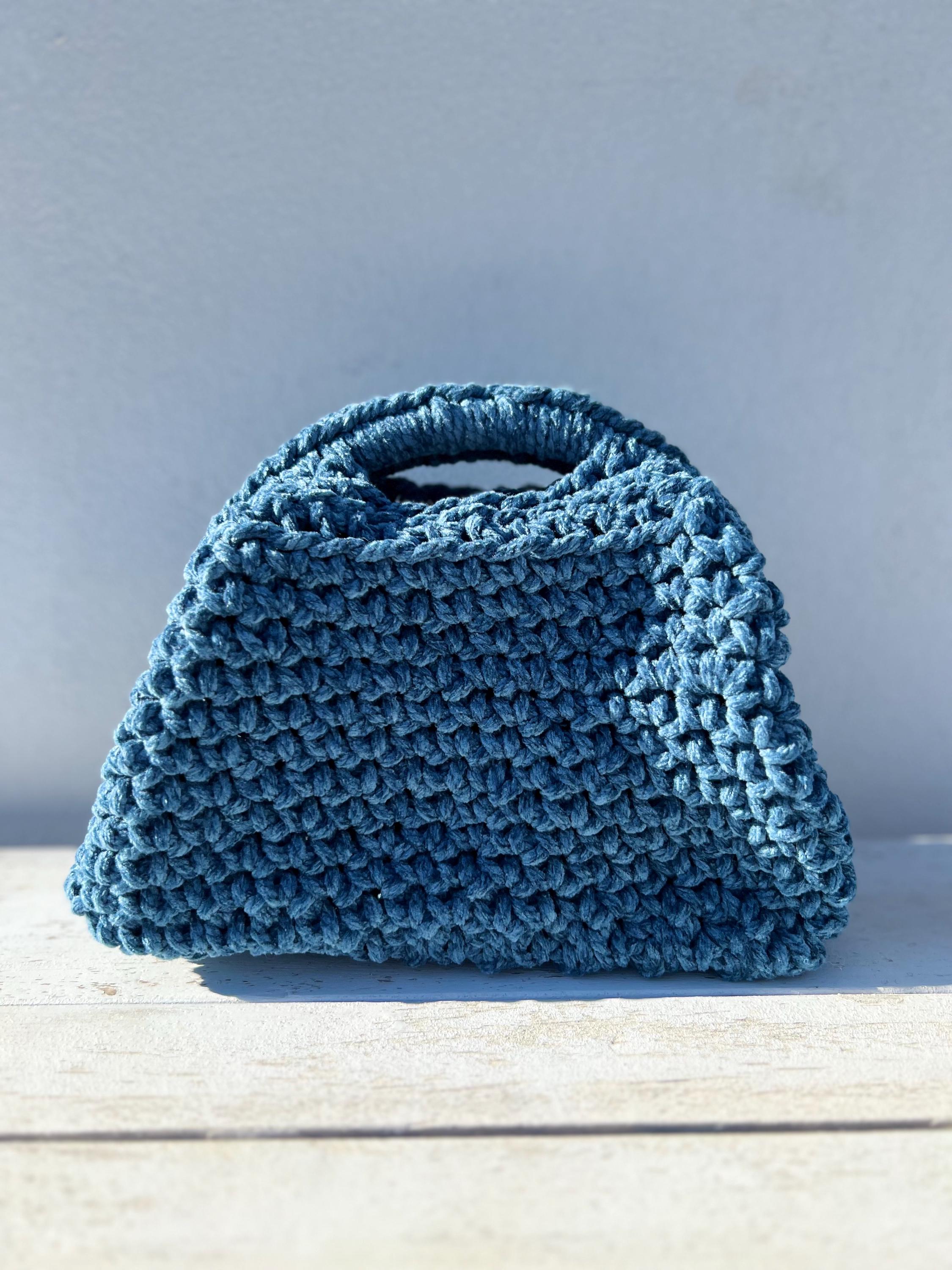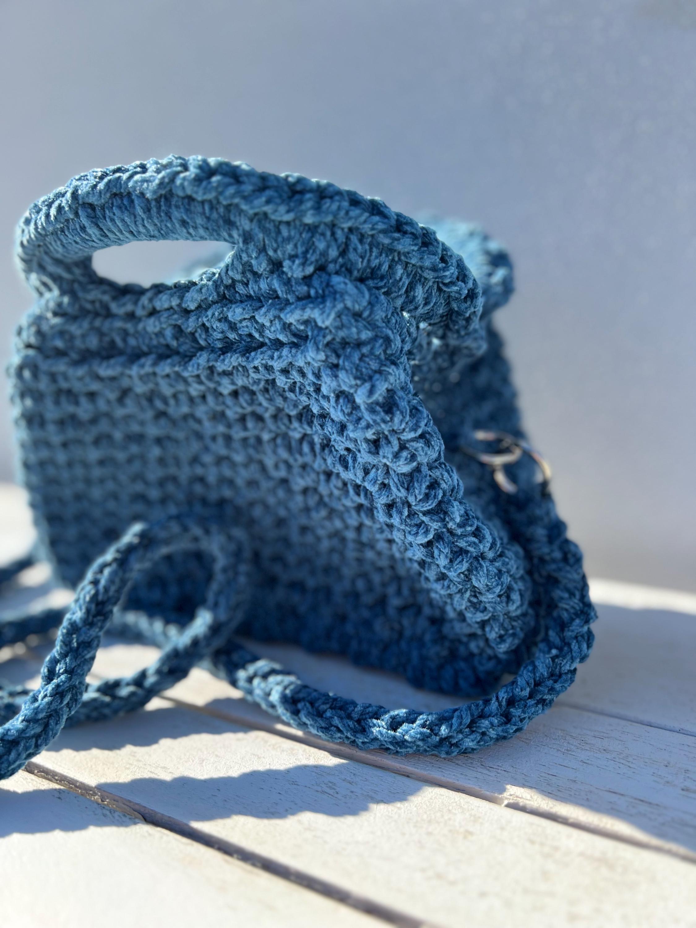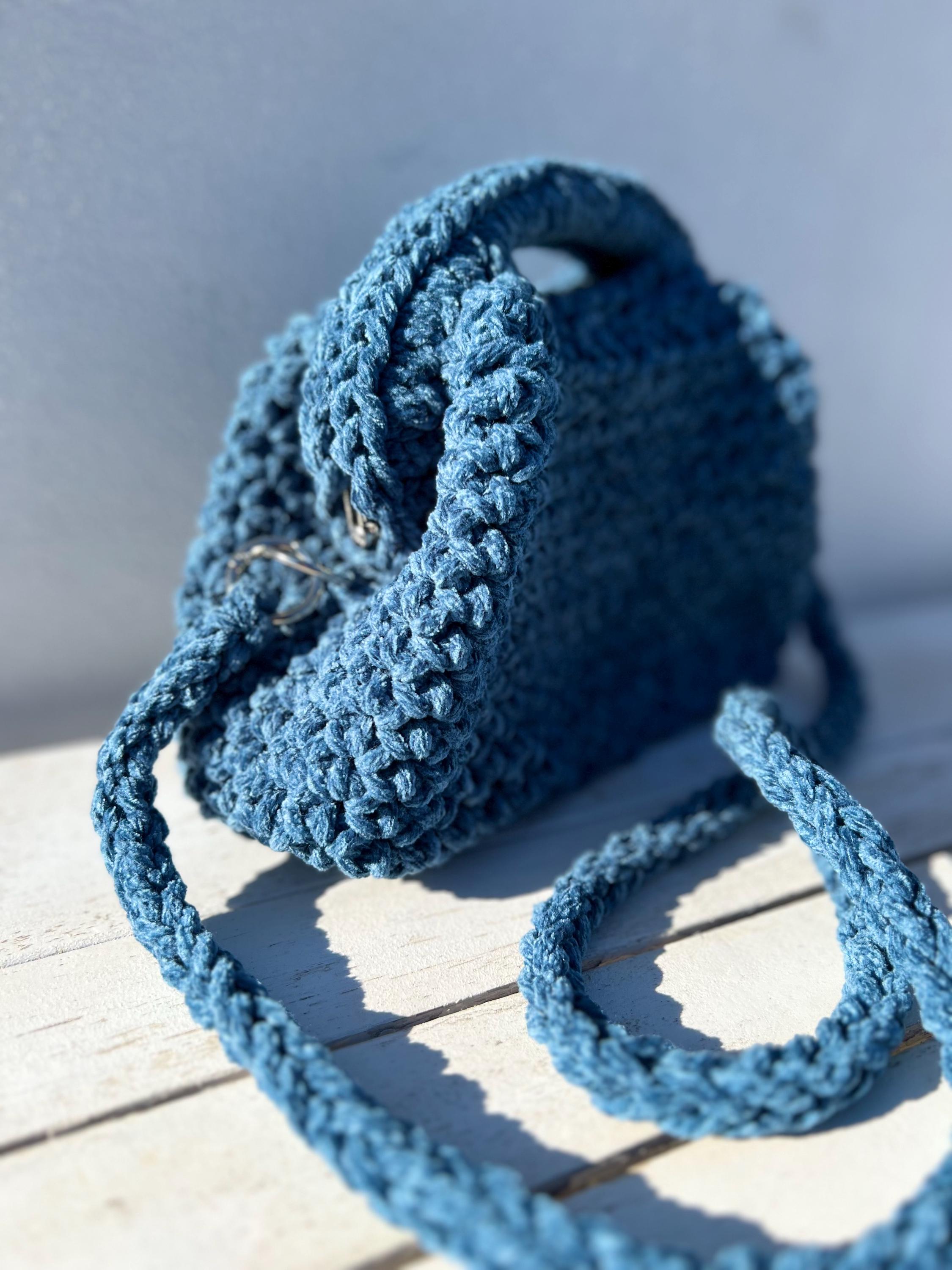 Crochet bag made with blue jeans velvet rope, click clack closure that acts as a handle and removable shoulder strap with side hooks size 25 x 20 cm