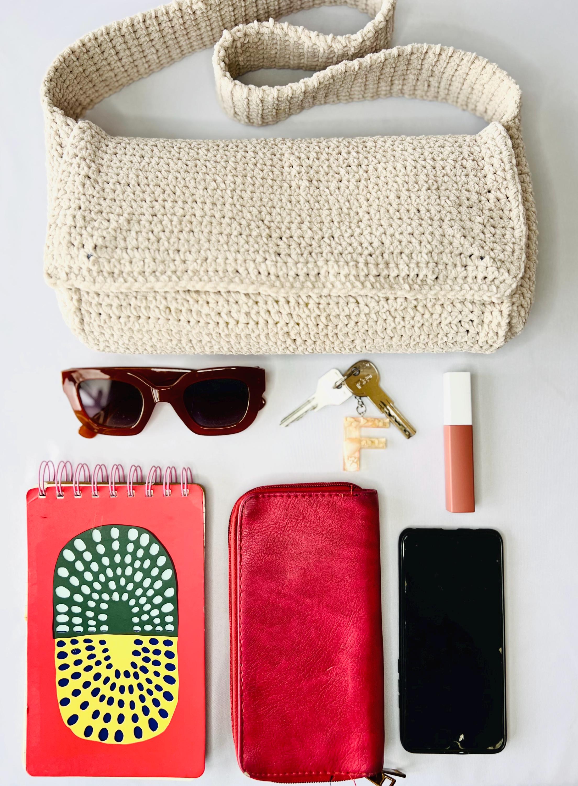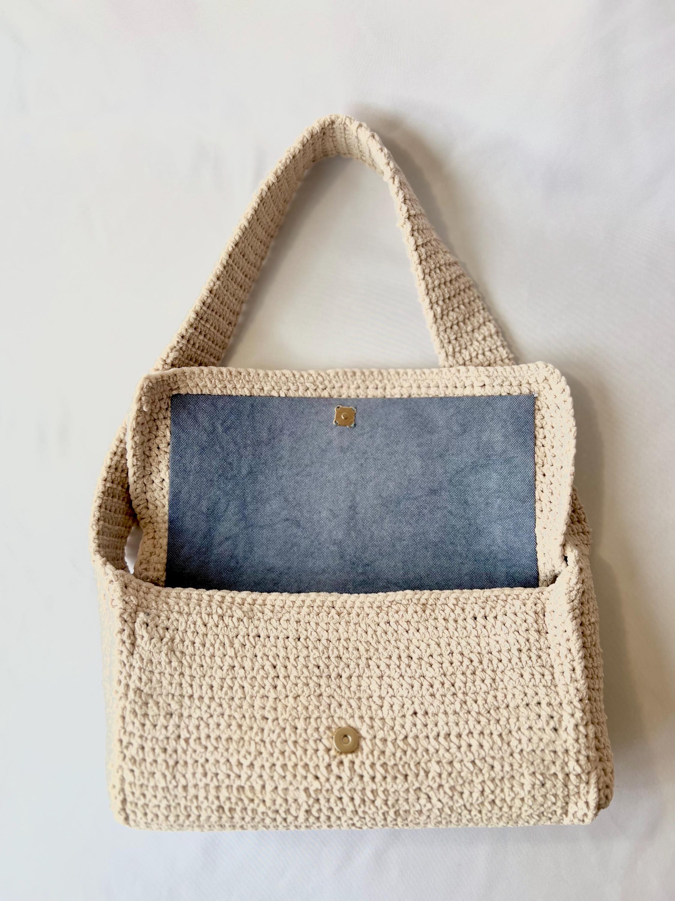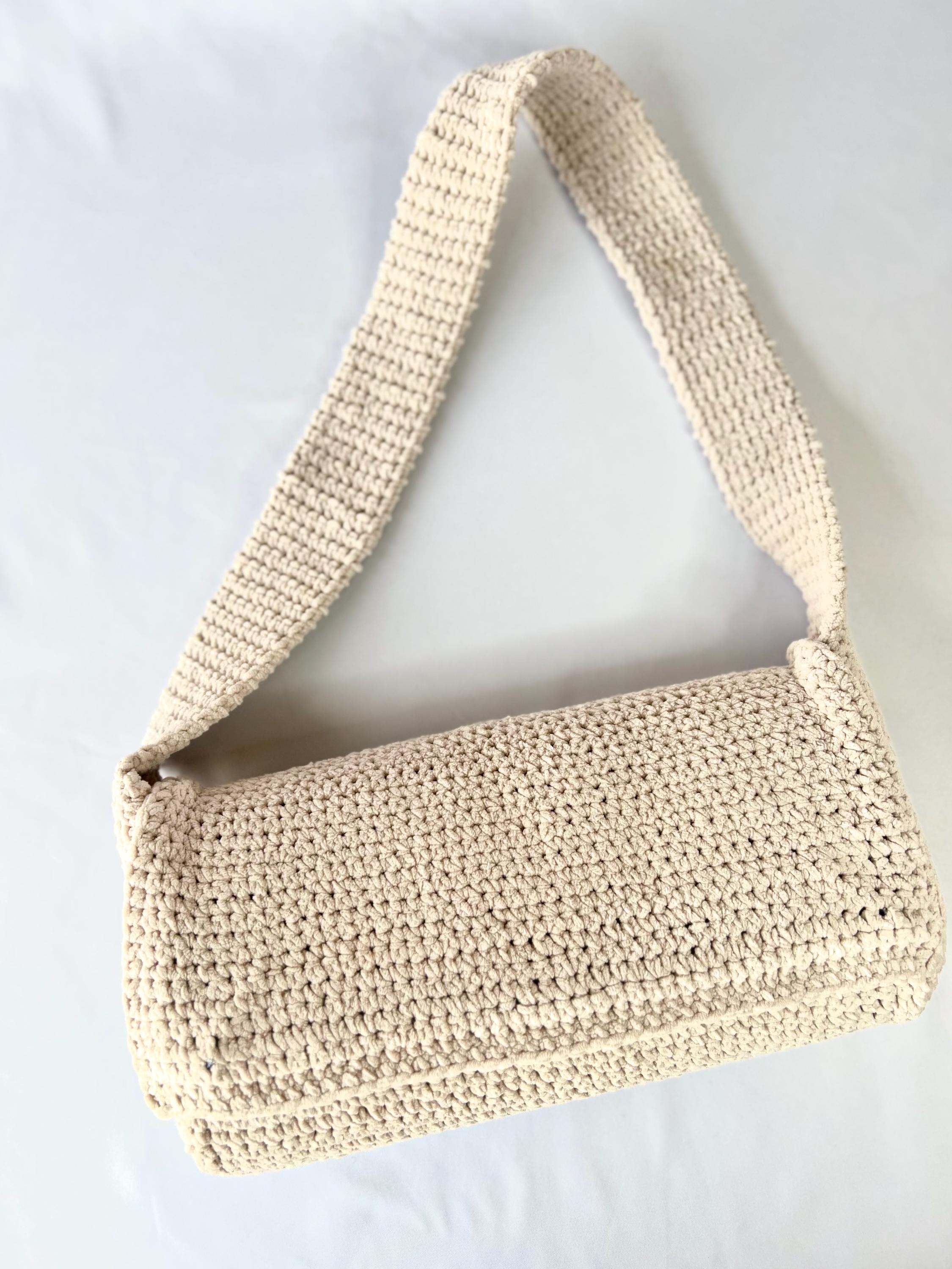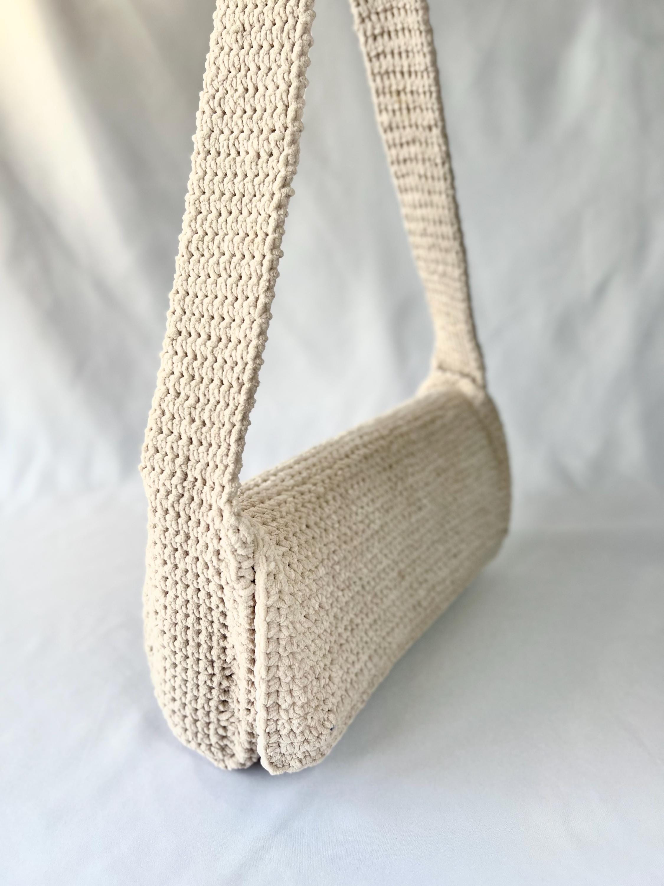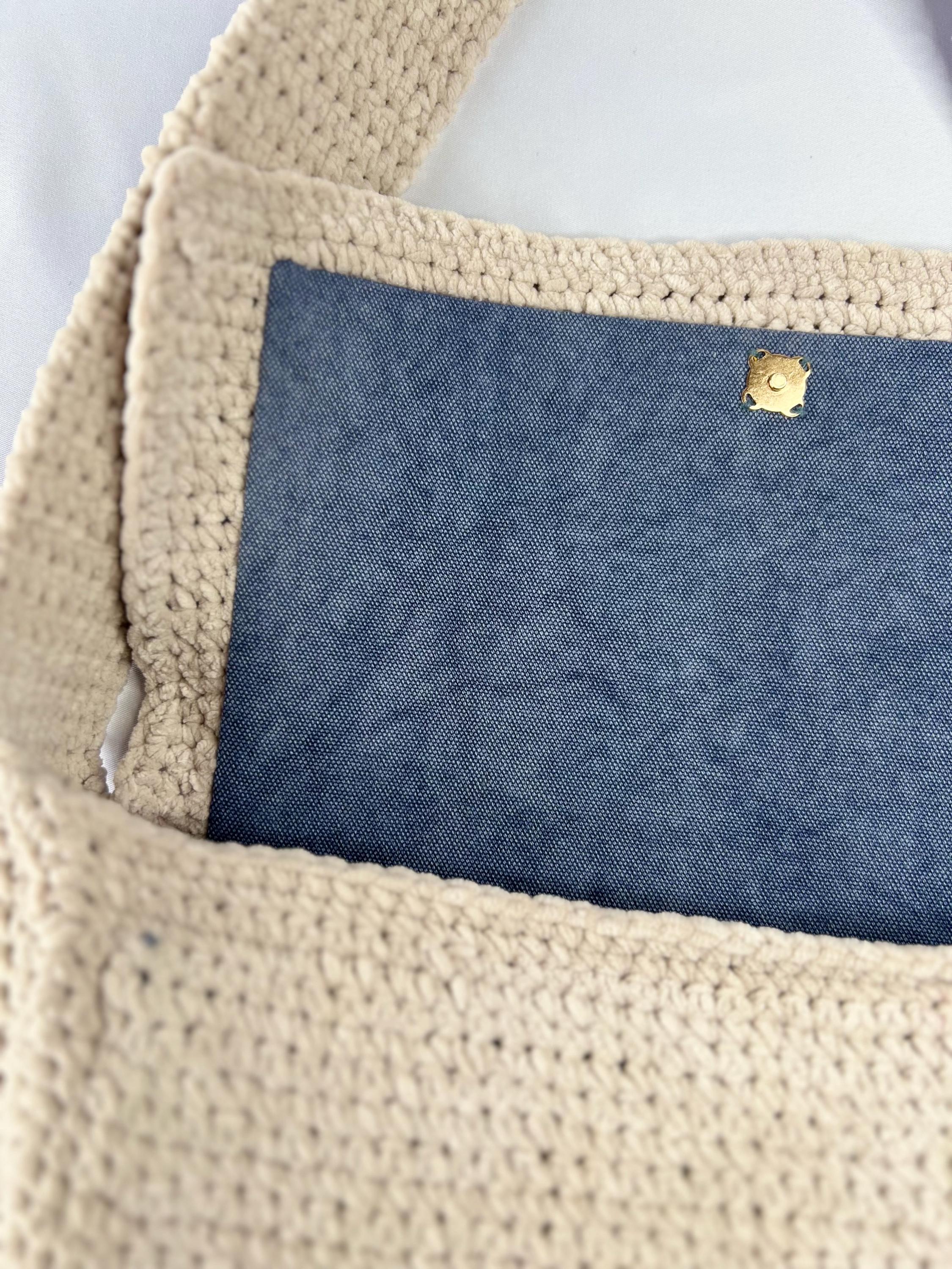 Shoulder bag made with crochet with very soft light beige/ivory chenille thread, with thick shoulder strap and magnetic closure. Inside it is lined with denim fabric and Eva reinforcement that make the bag more structured and resistant.