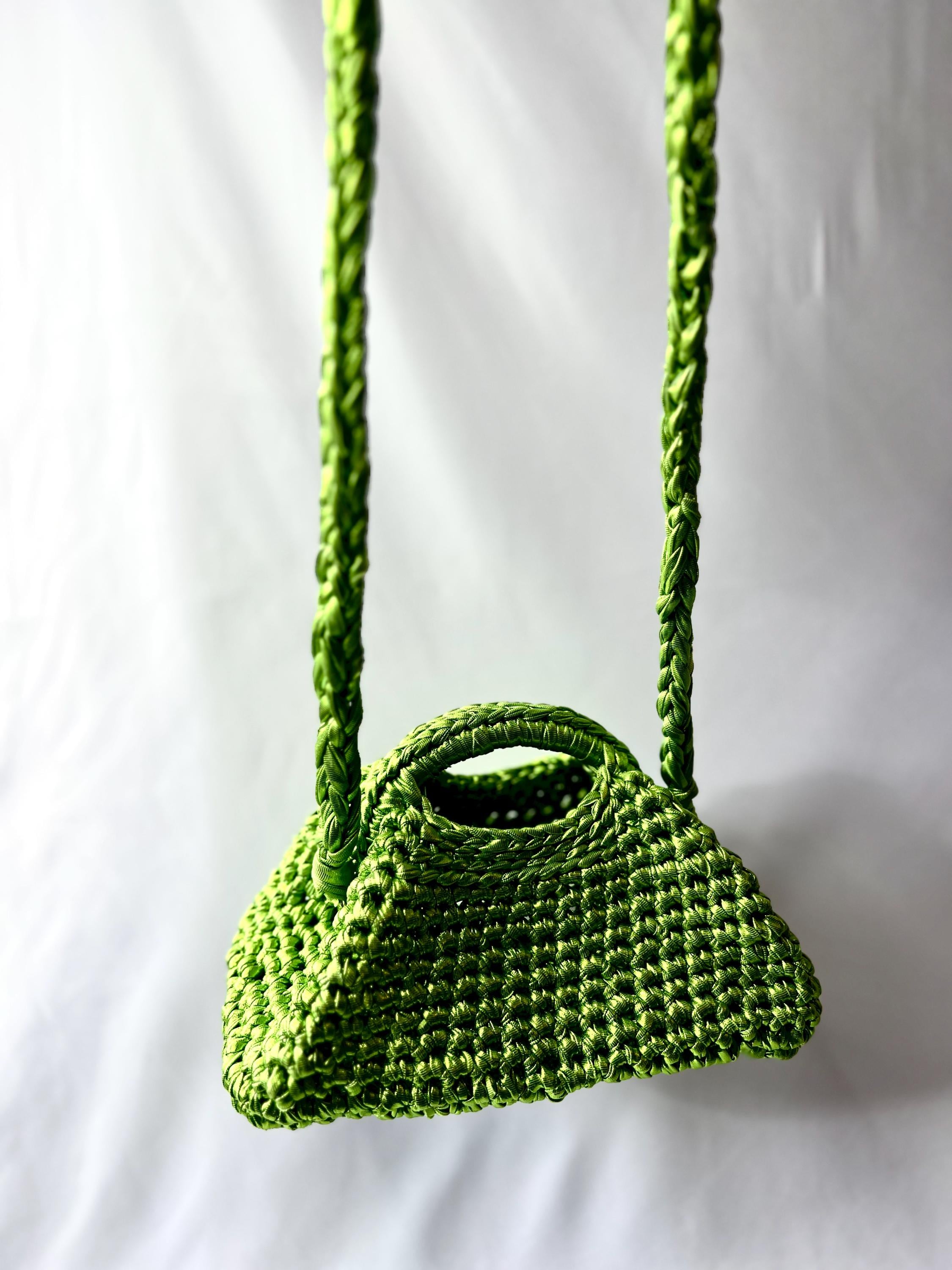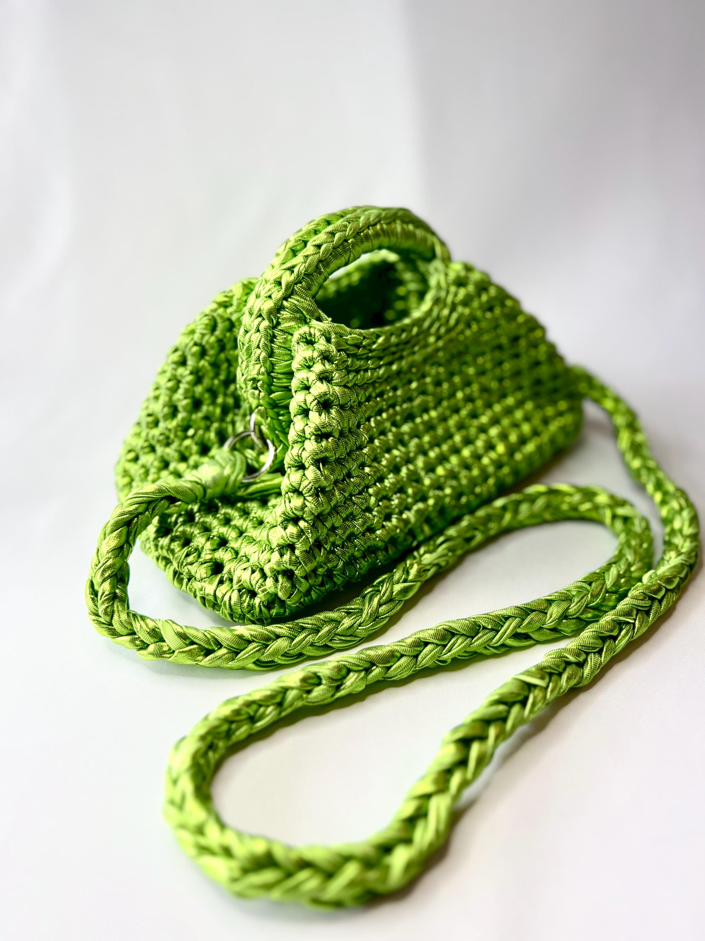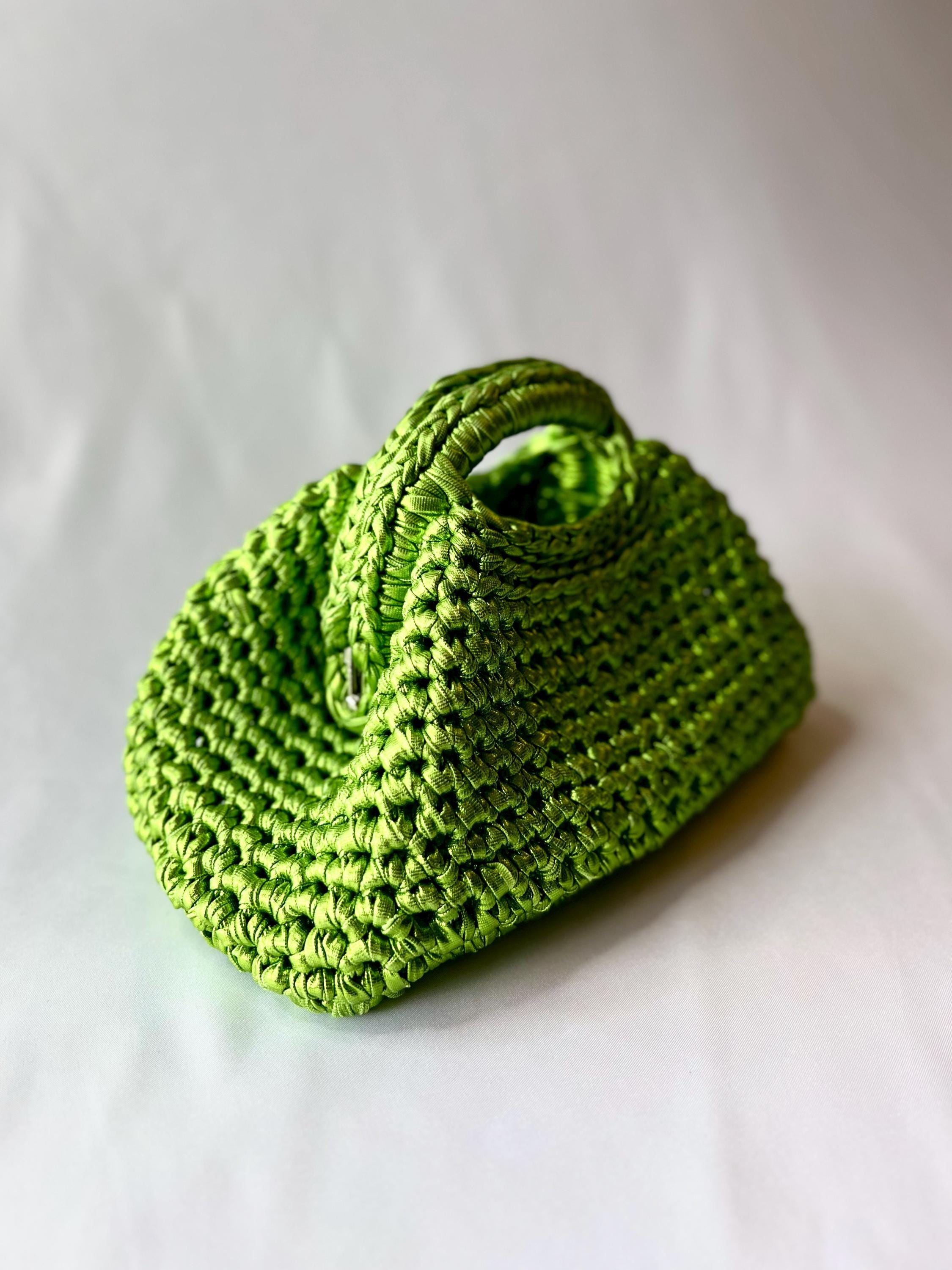 Crochet clutch bag made with acid green lamé thread, click clack closure that acts as a handle, with removable braided shoulder strap.