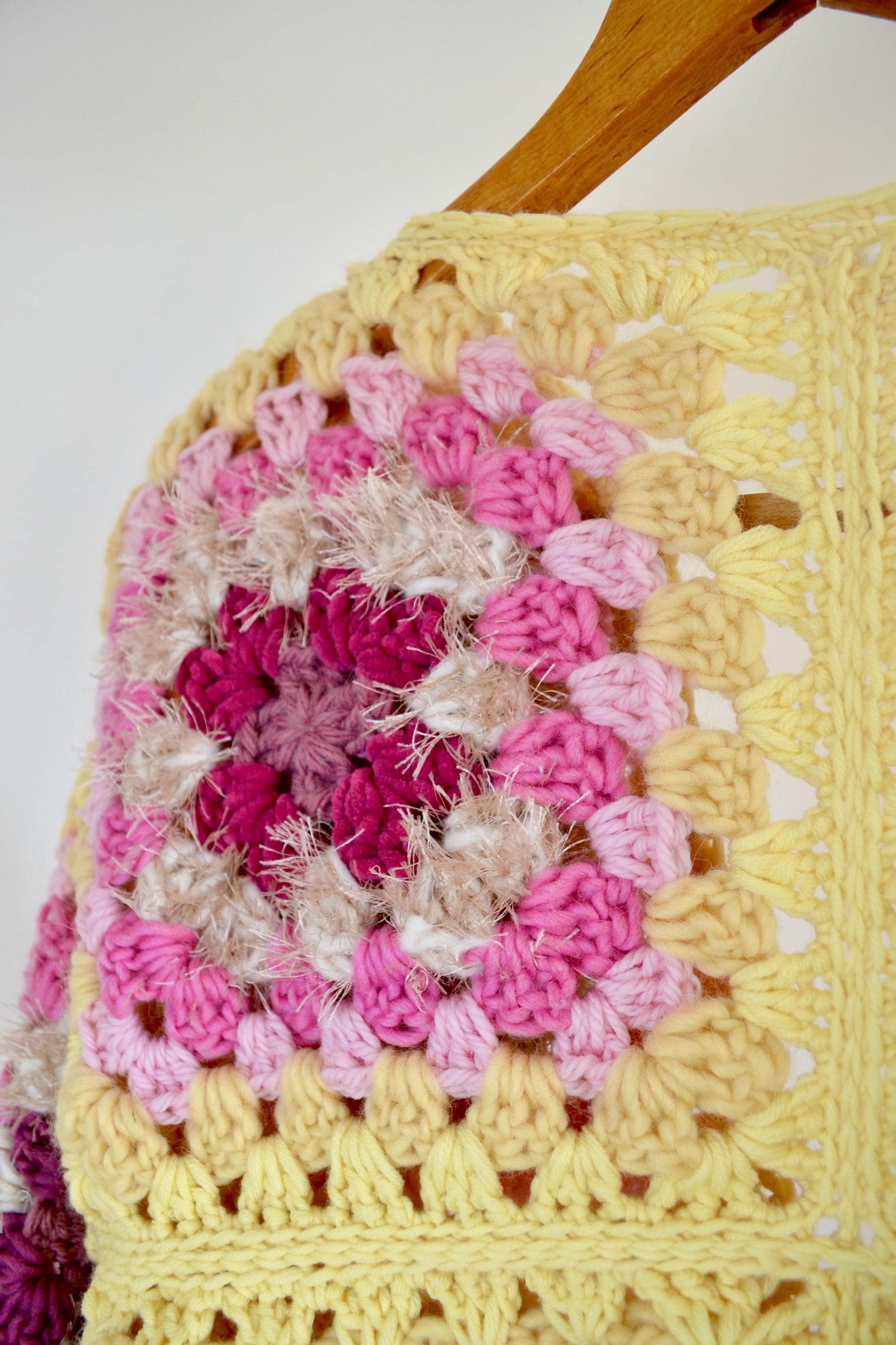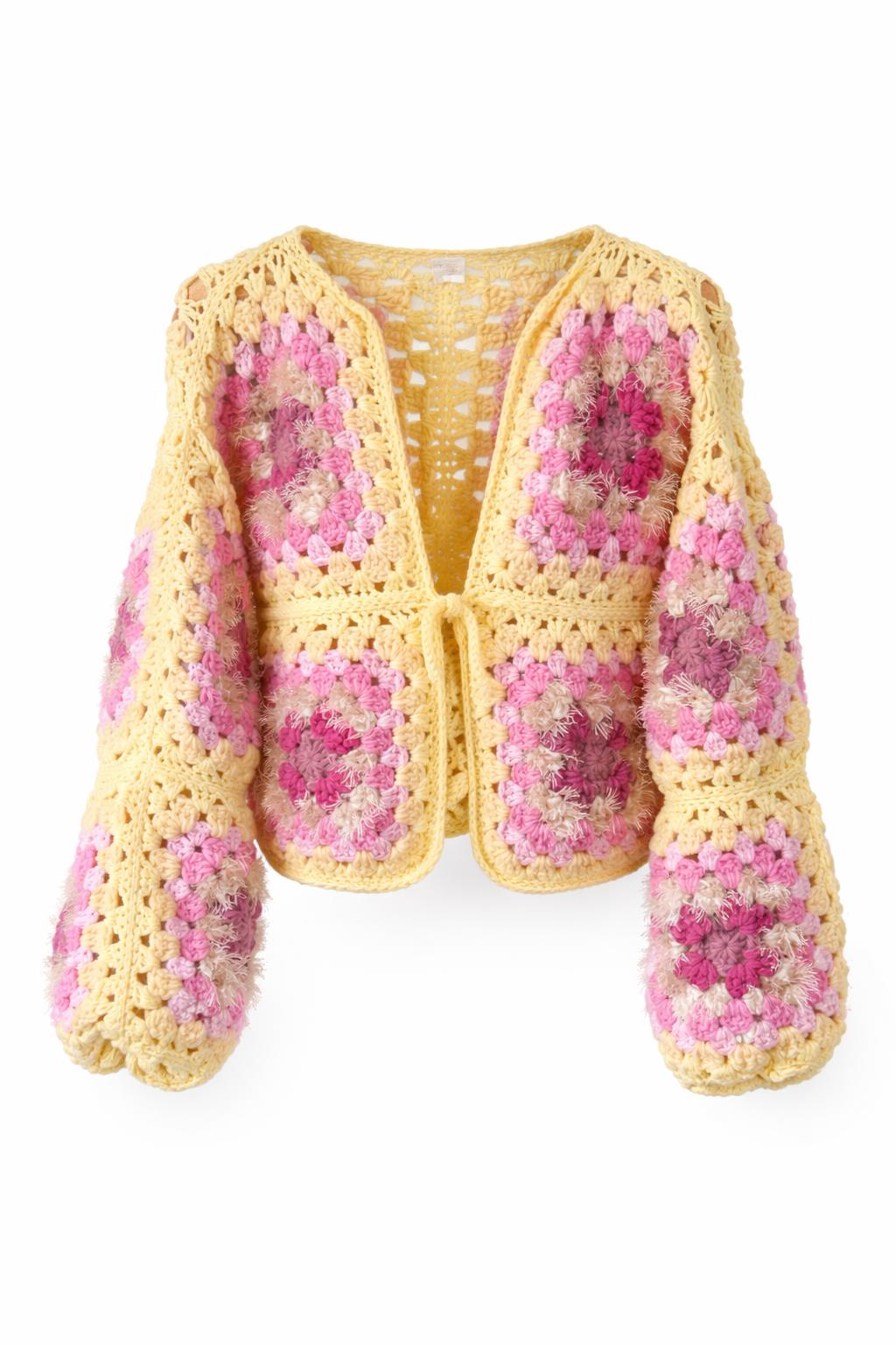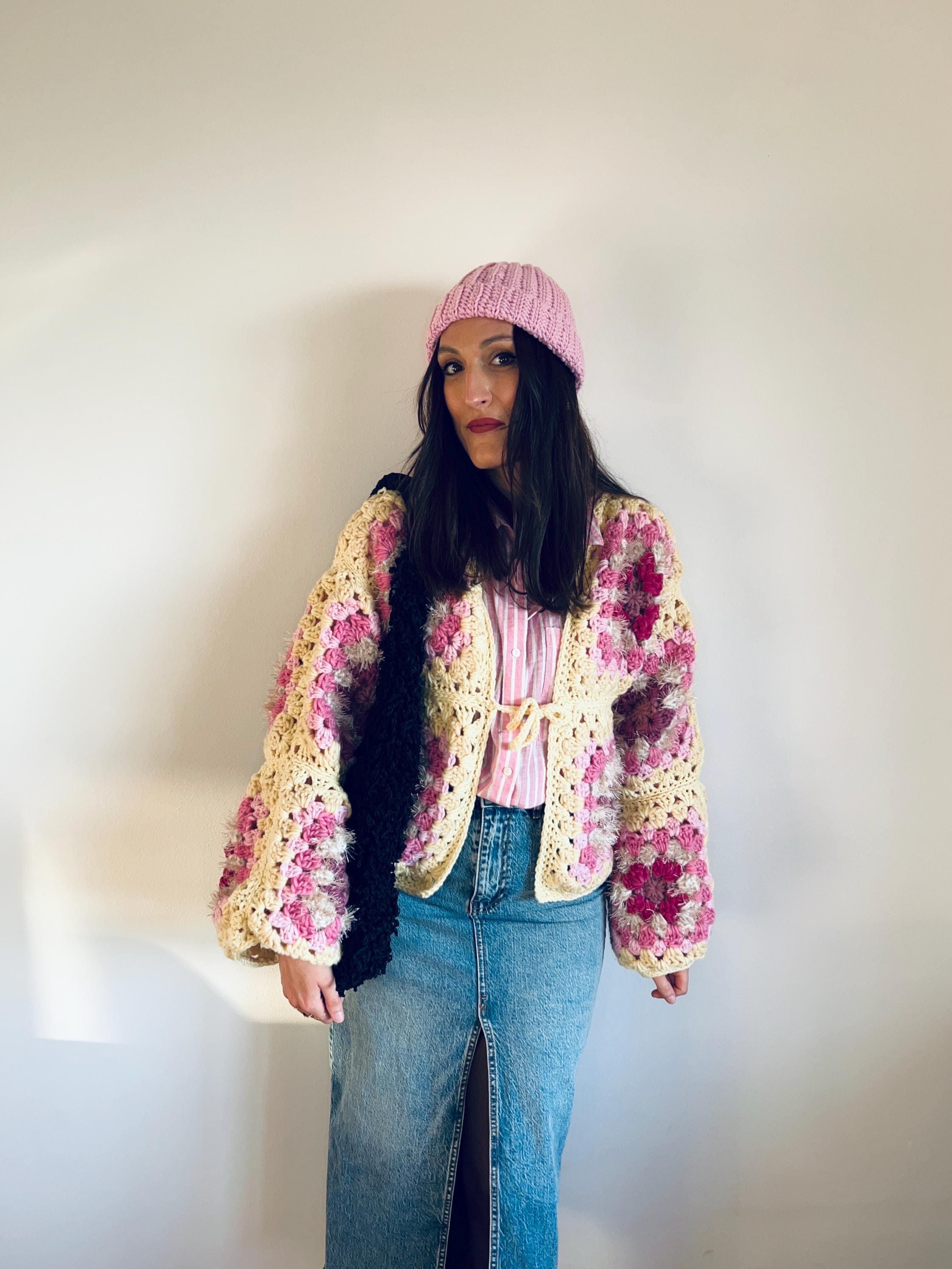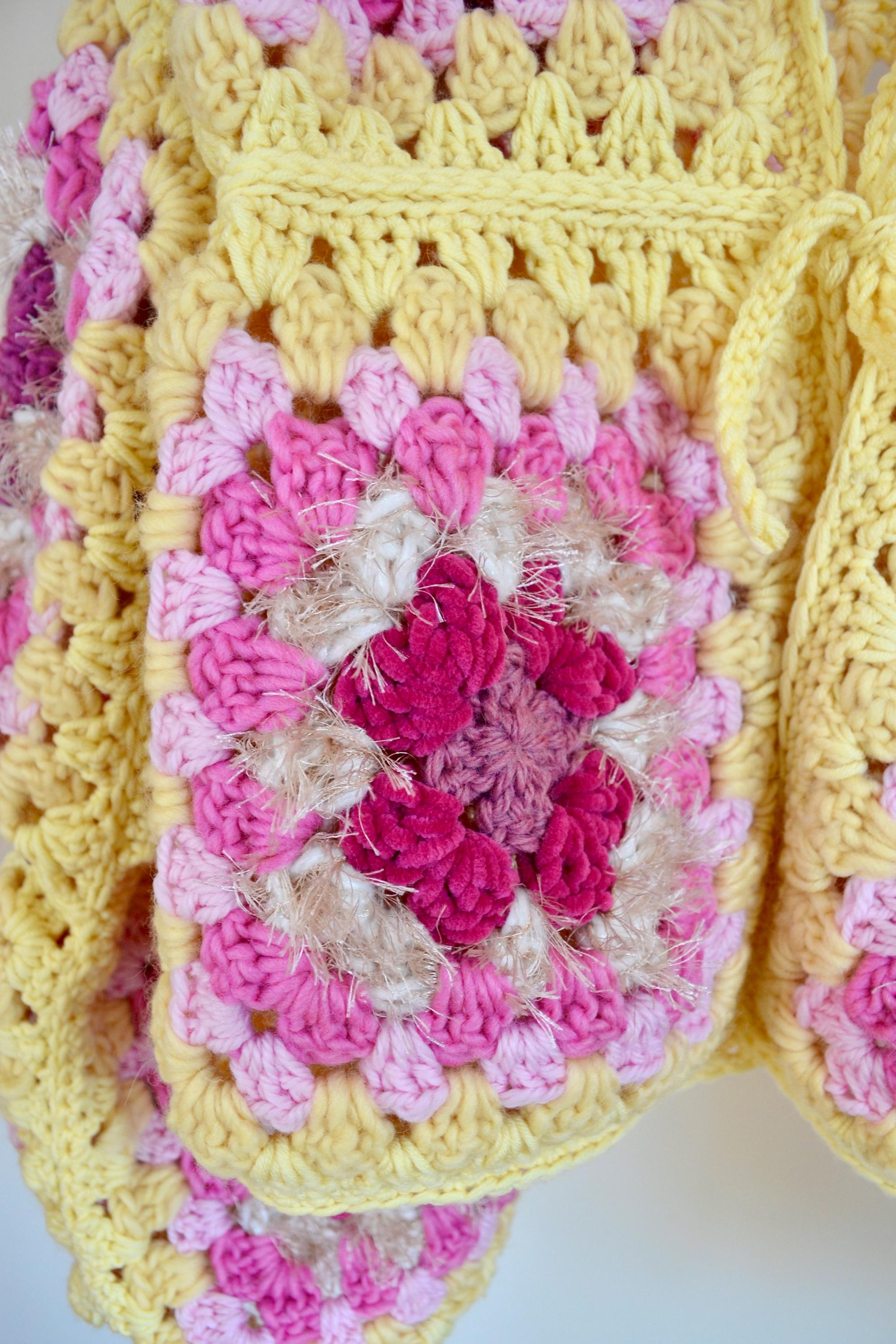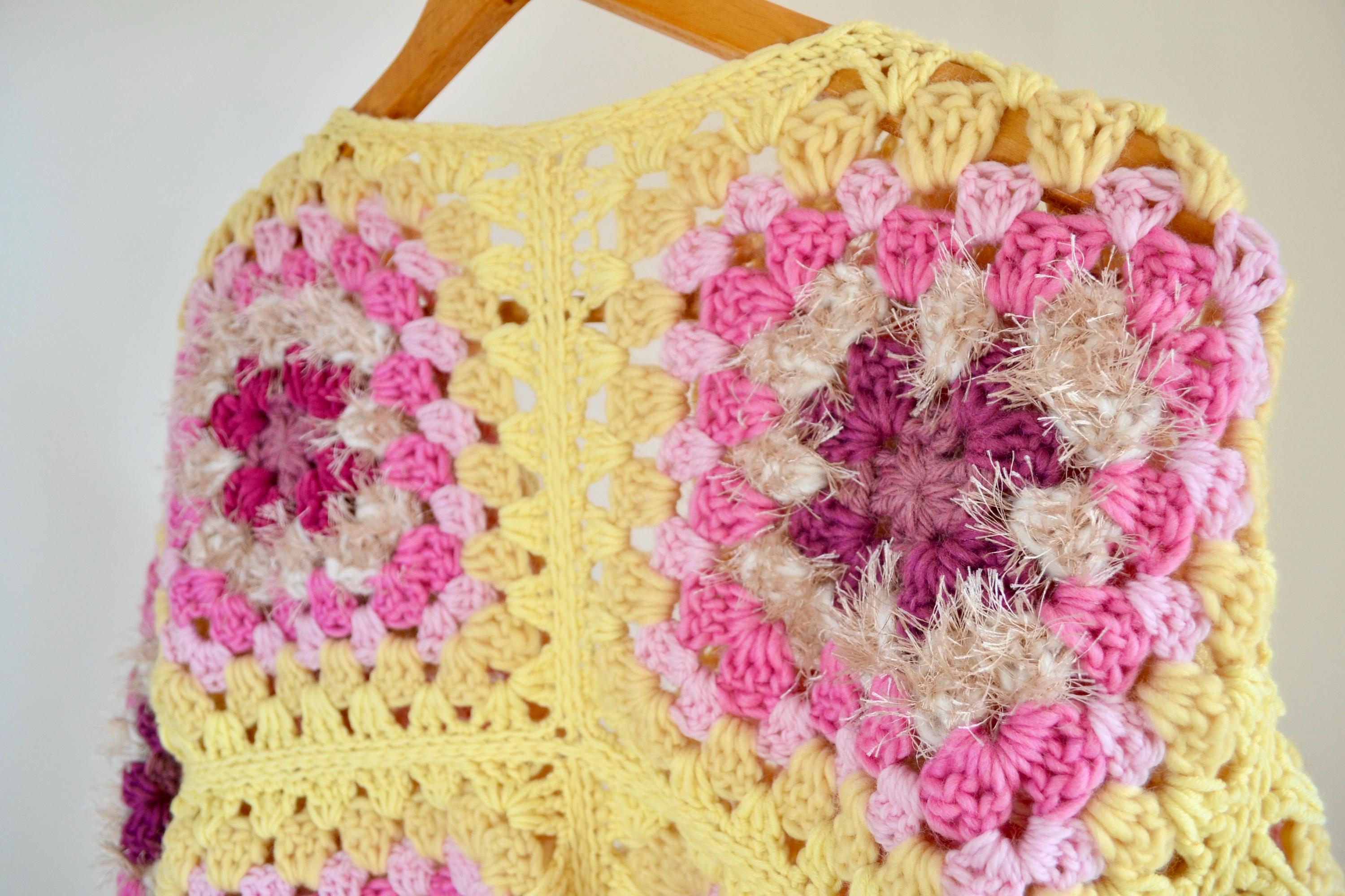 Meraviglioso cardigan realizzato all’uncinetto in pura lana vergine e merino con filato di qualità e con piccoli inserti di filato peloso, con tecnica granny square