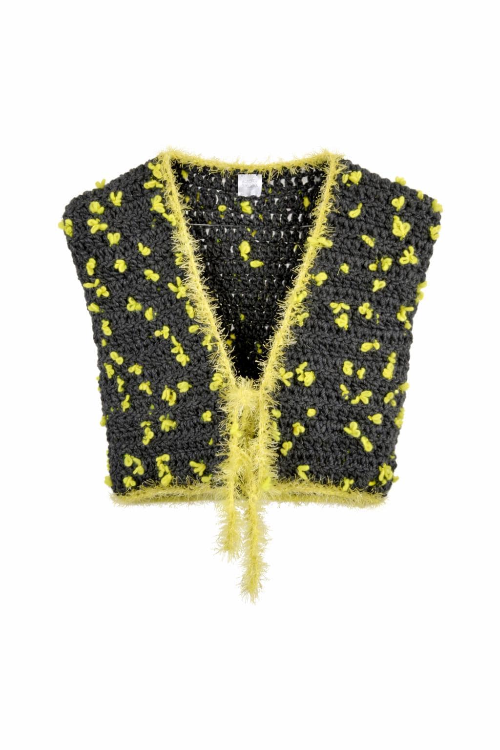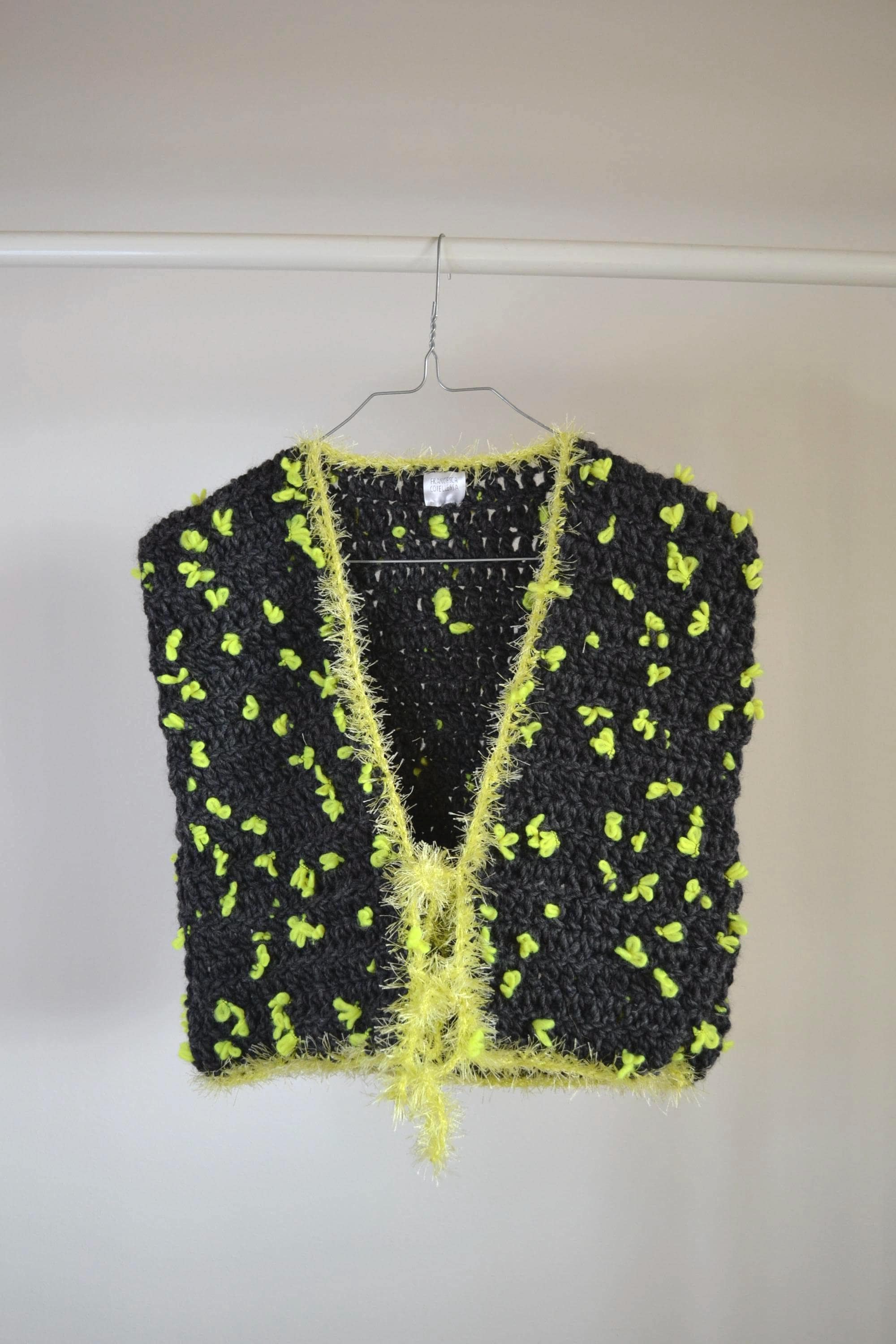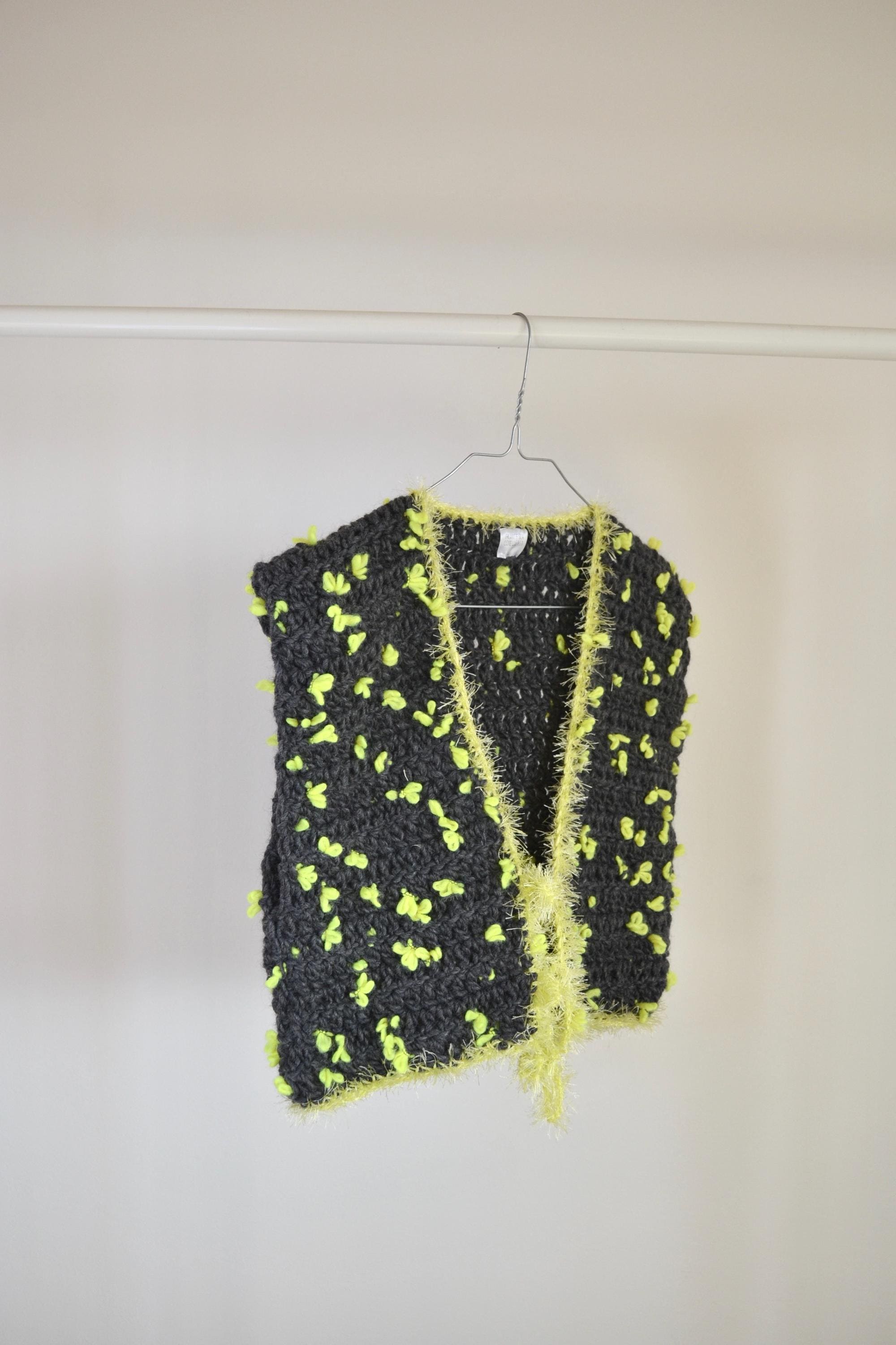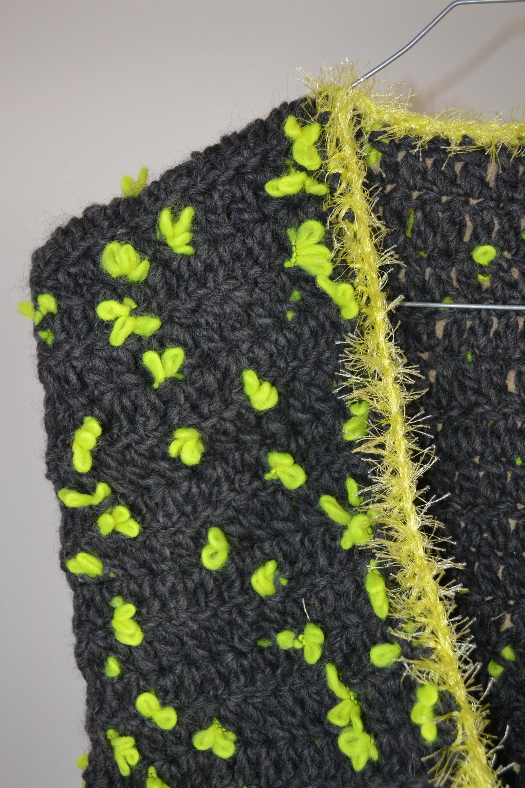 Very original dark grey vest with floral details made in crochet with 100% wool yarn with details and finishing in lime-coloured fur yarn.One size fits all from XS to M/L