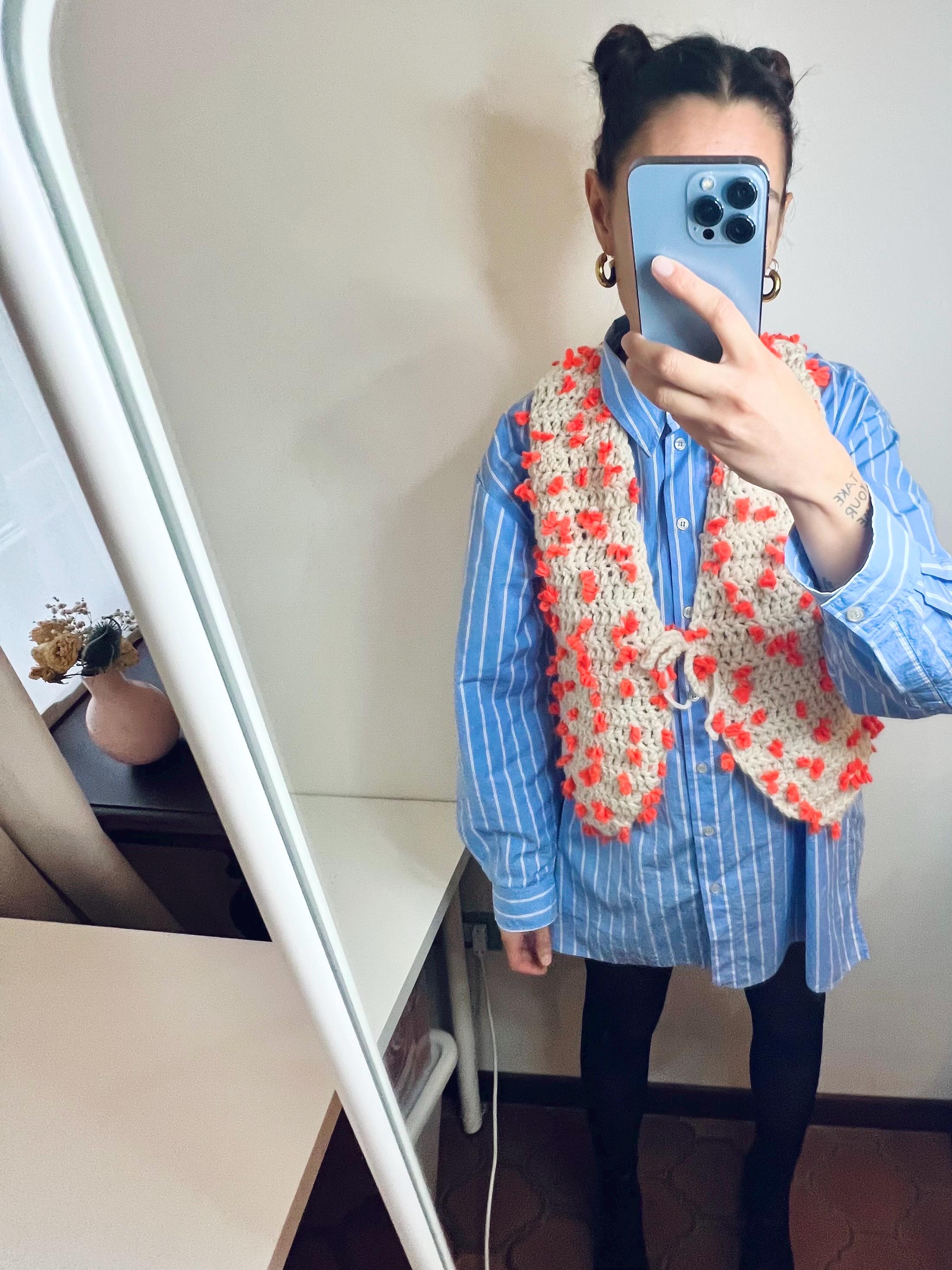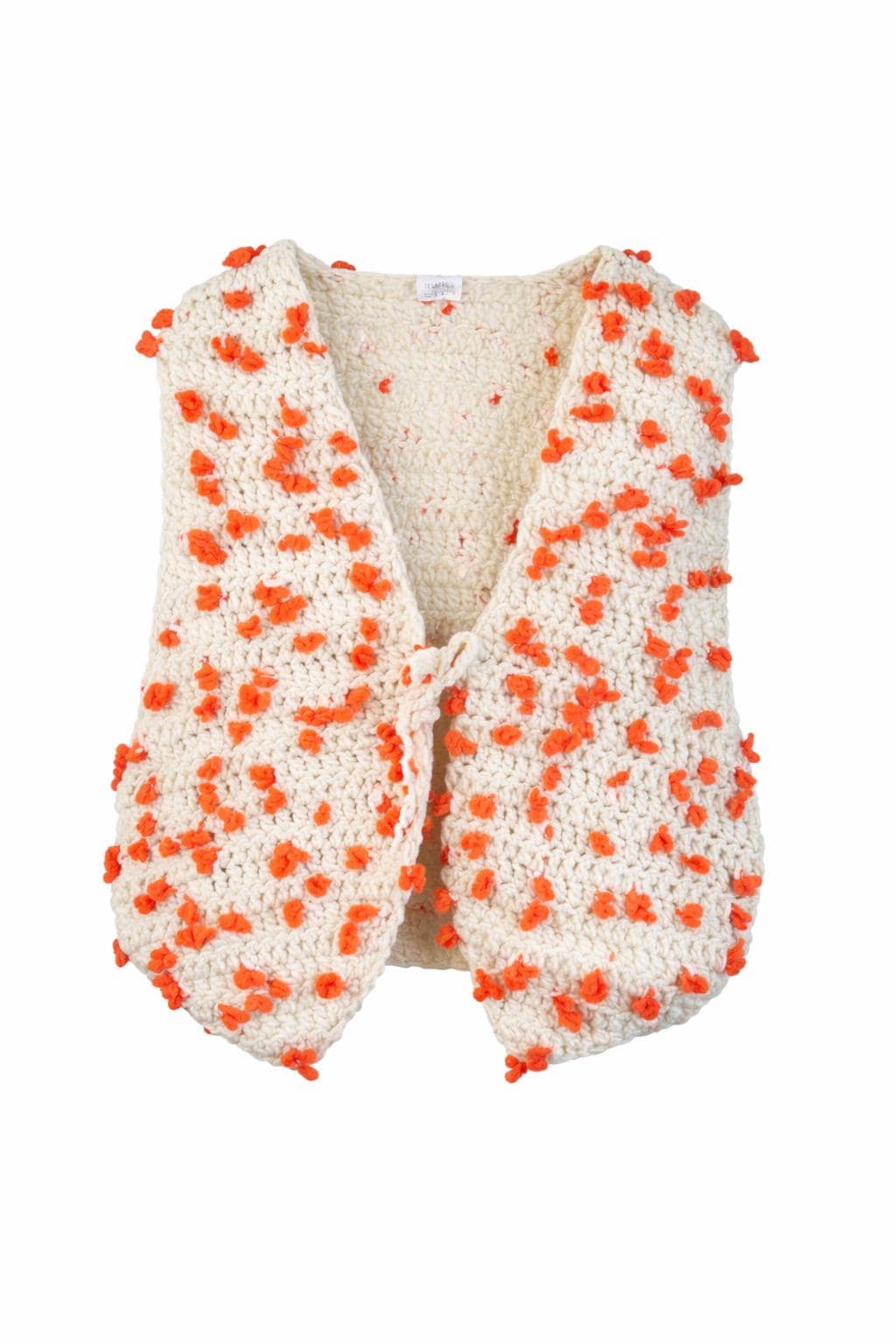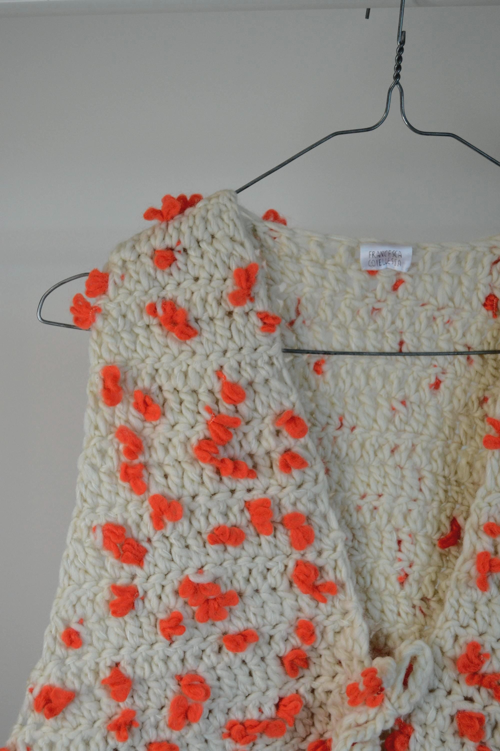 Very original white vest with fluorescent orange floral details made in crochet with 100% wool yarn, suit vest style model, shorter at the back and with points at the frontOne size fits all S to L