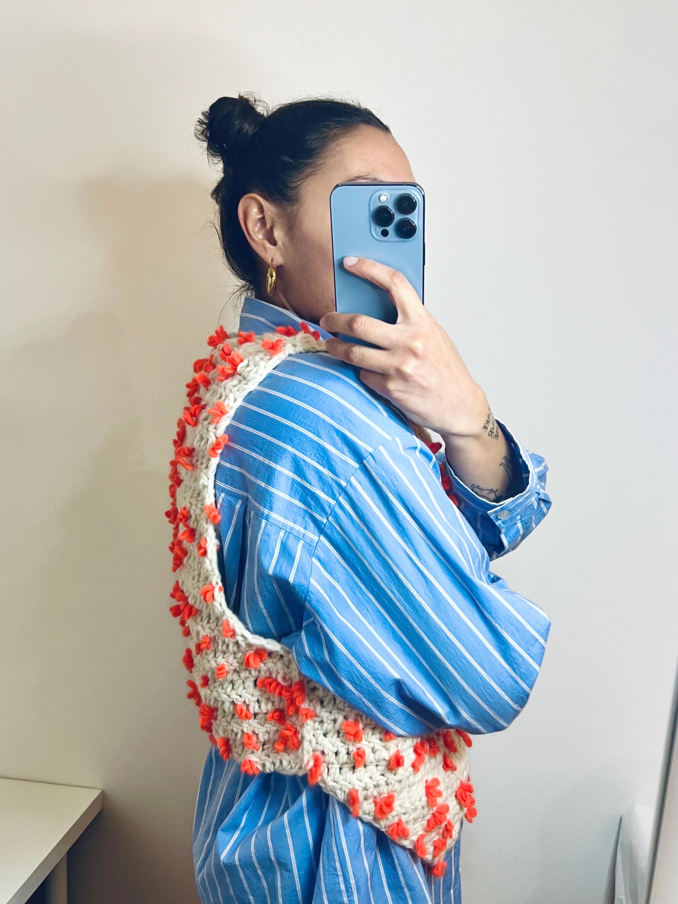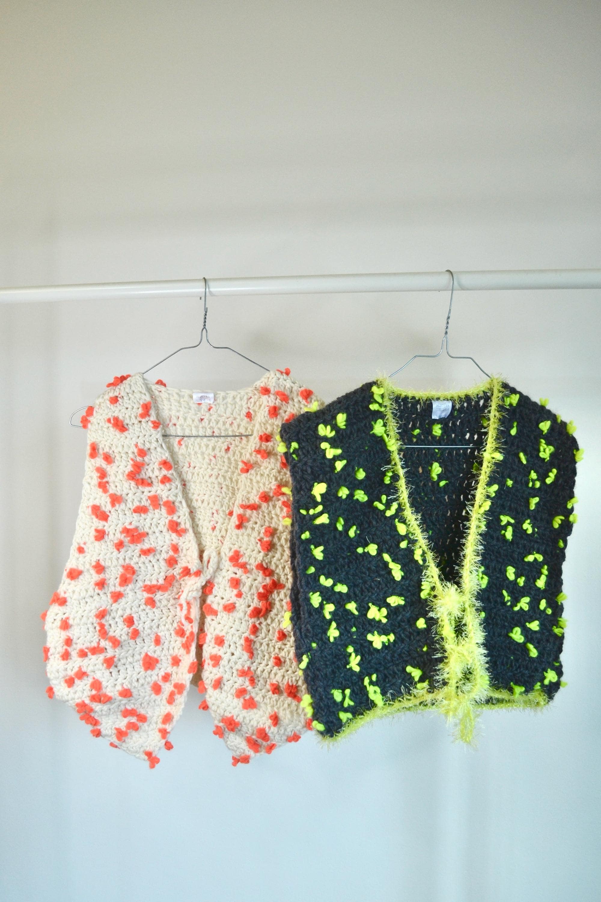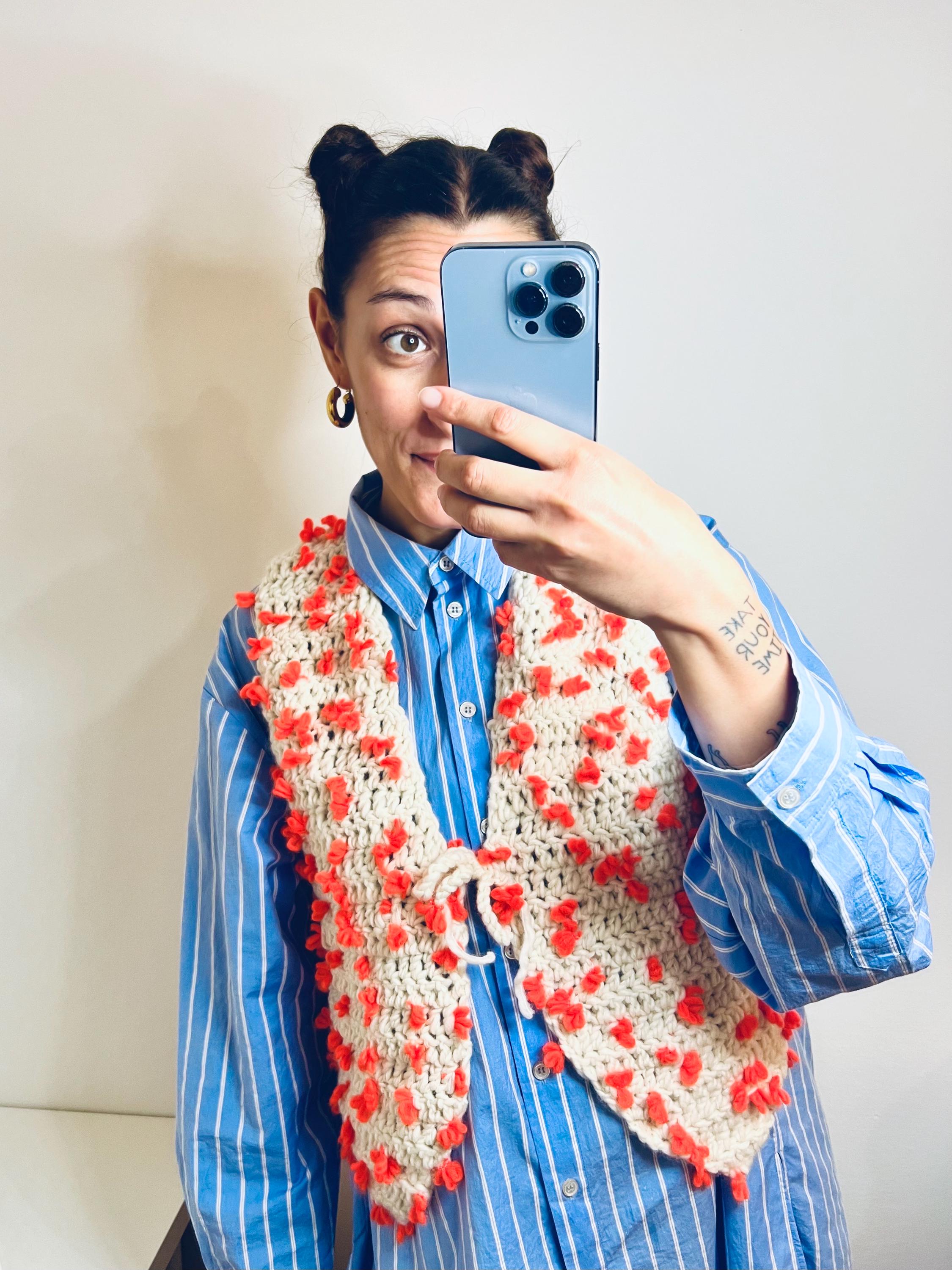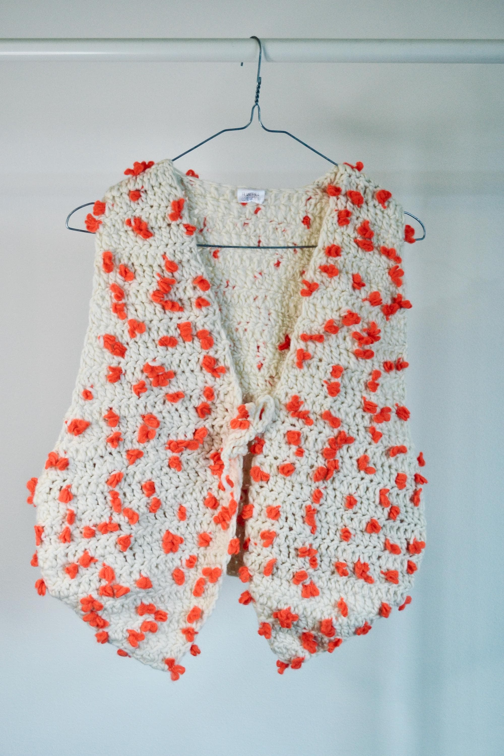 Very original white vest with fluorescent orange floral details made in crochet with 100% wool yarn, suit vest style model, shorter at the back and with points at the frontOne size fits all S to L