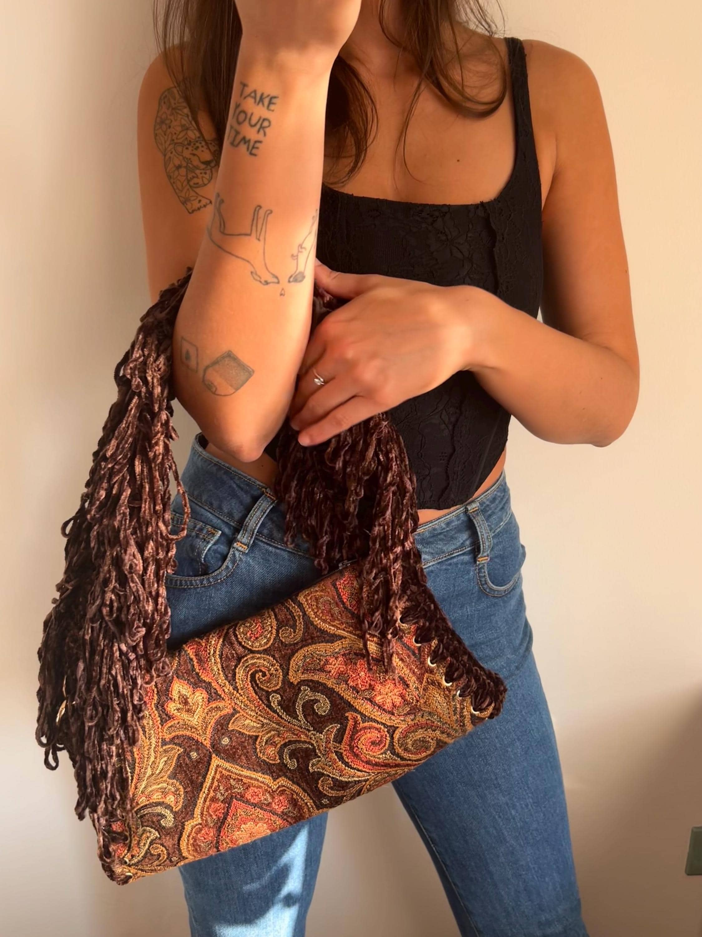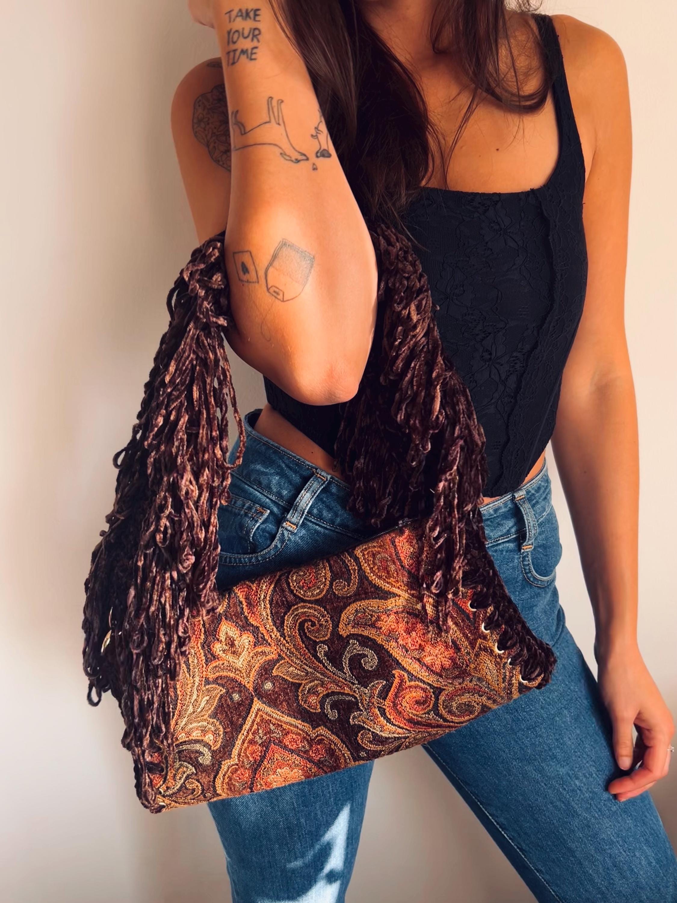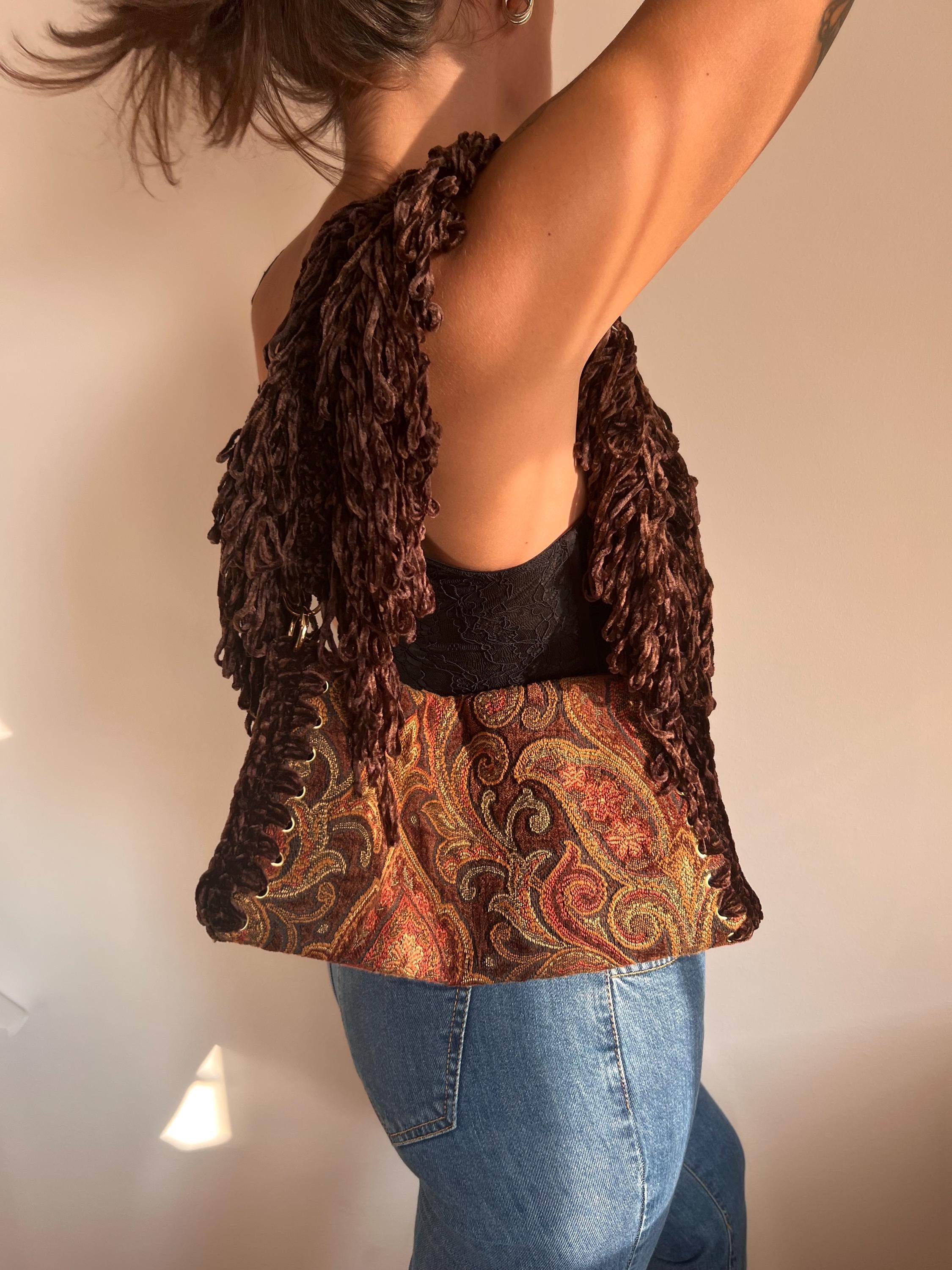 Bag made from recycled brocade fabric vest, shoulder bag with brown chenille strap and crocheted side seamsGold-colored rings and metalwareZip closureInternal lining with pocket