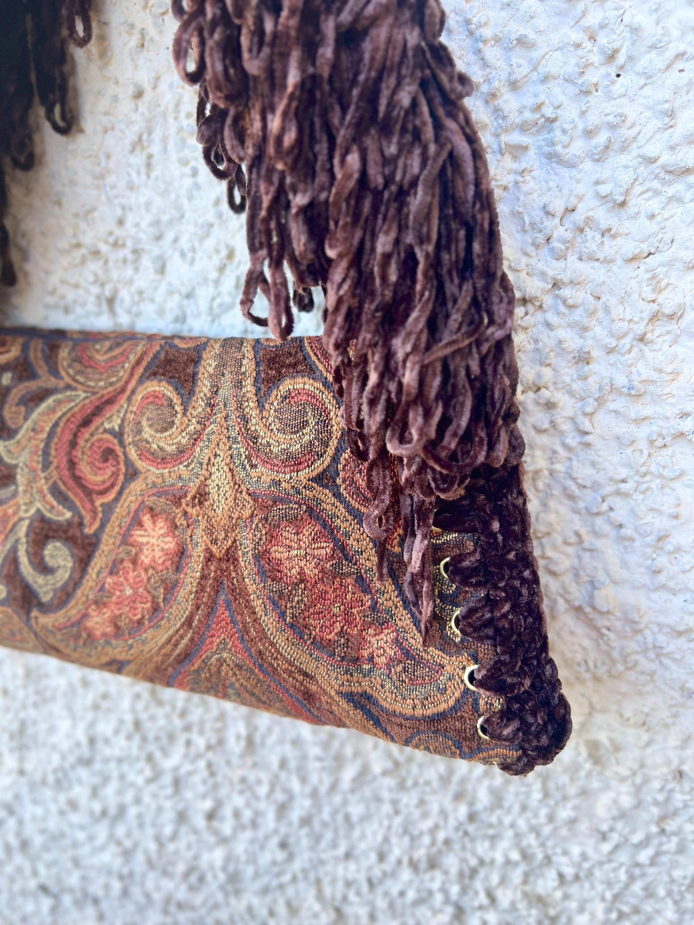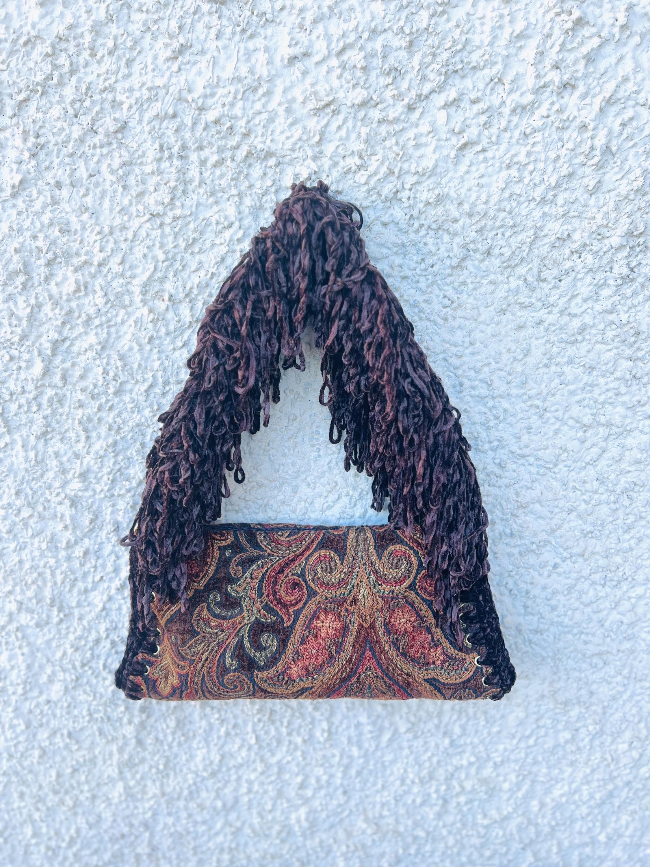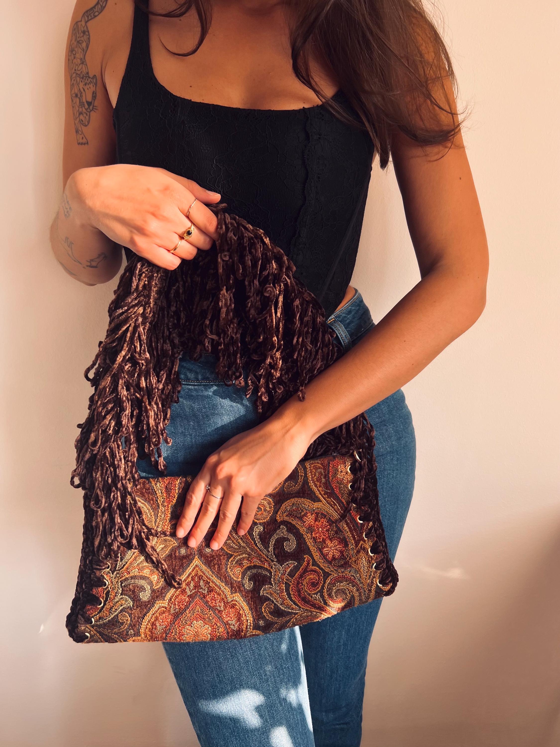 Bag made from recycled brocade fabric vest, shoulder bag with brown chenille strap and crocheted side seamsGold-colored rings and metalwareZip closureInternal lining with pocket