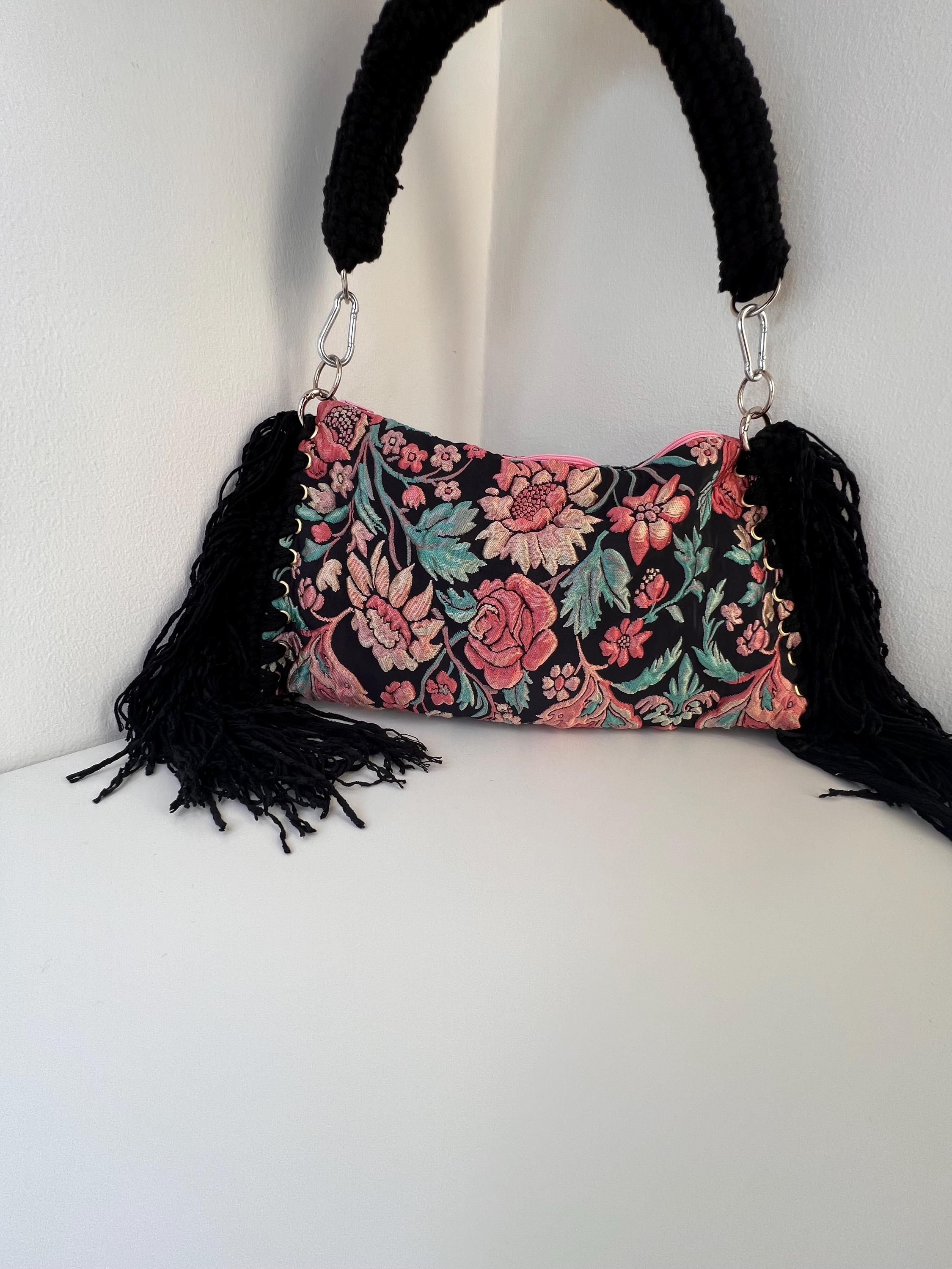 Soft bag made of fine brocade fabric in the colours of blue/green, pink and black