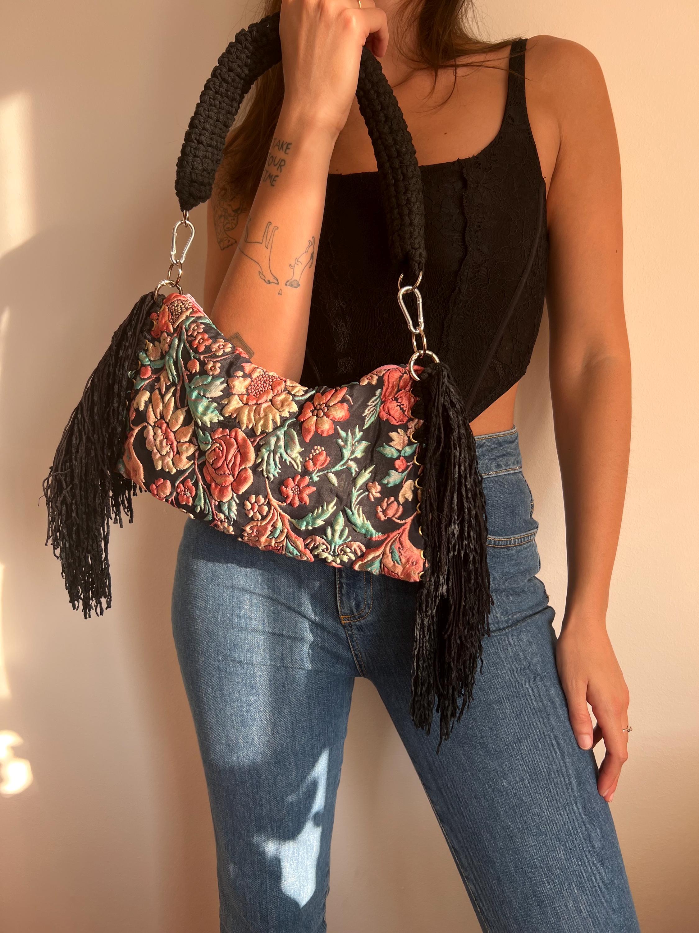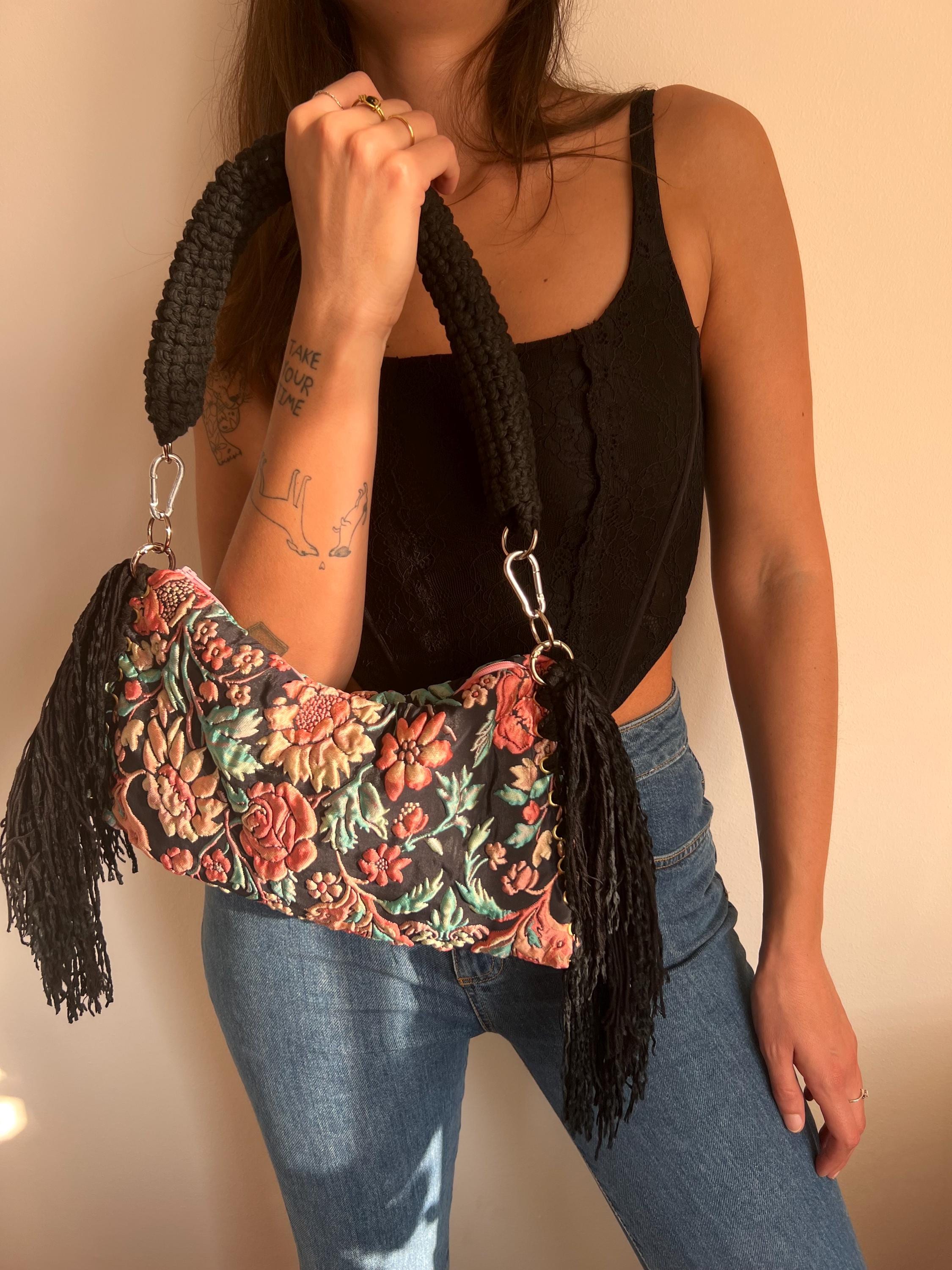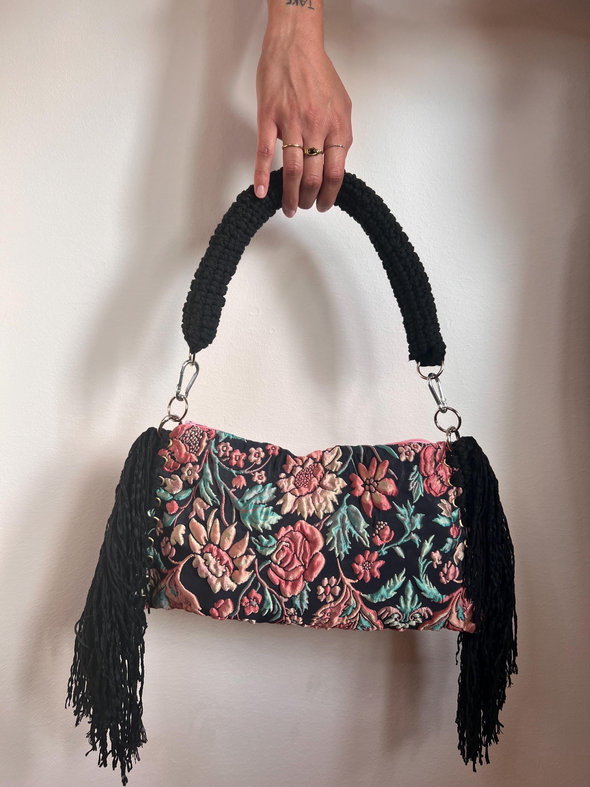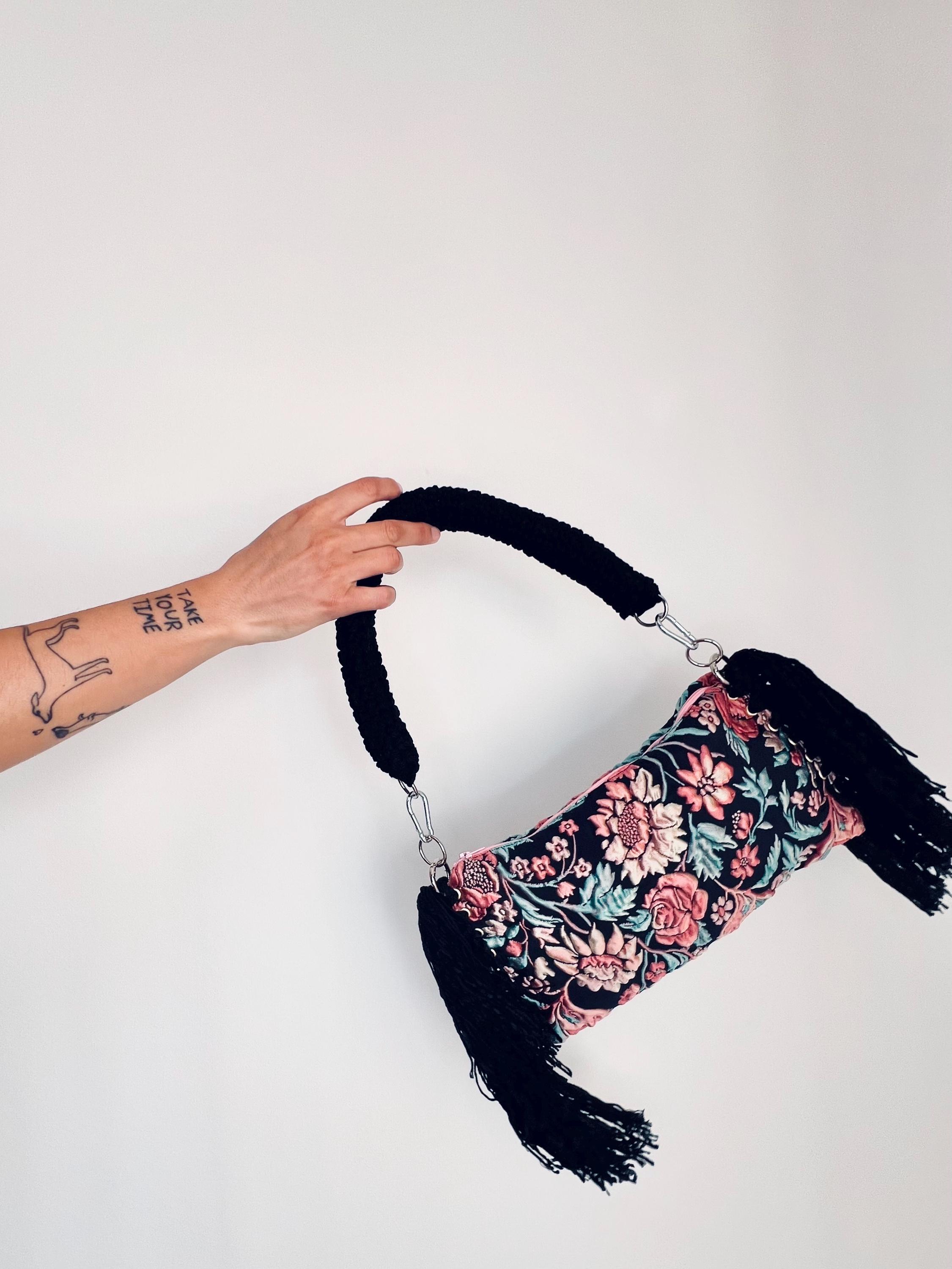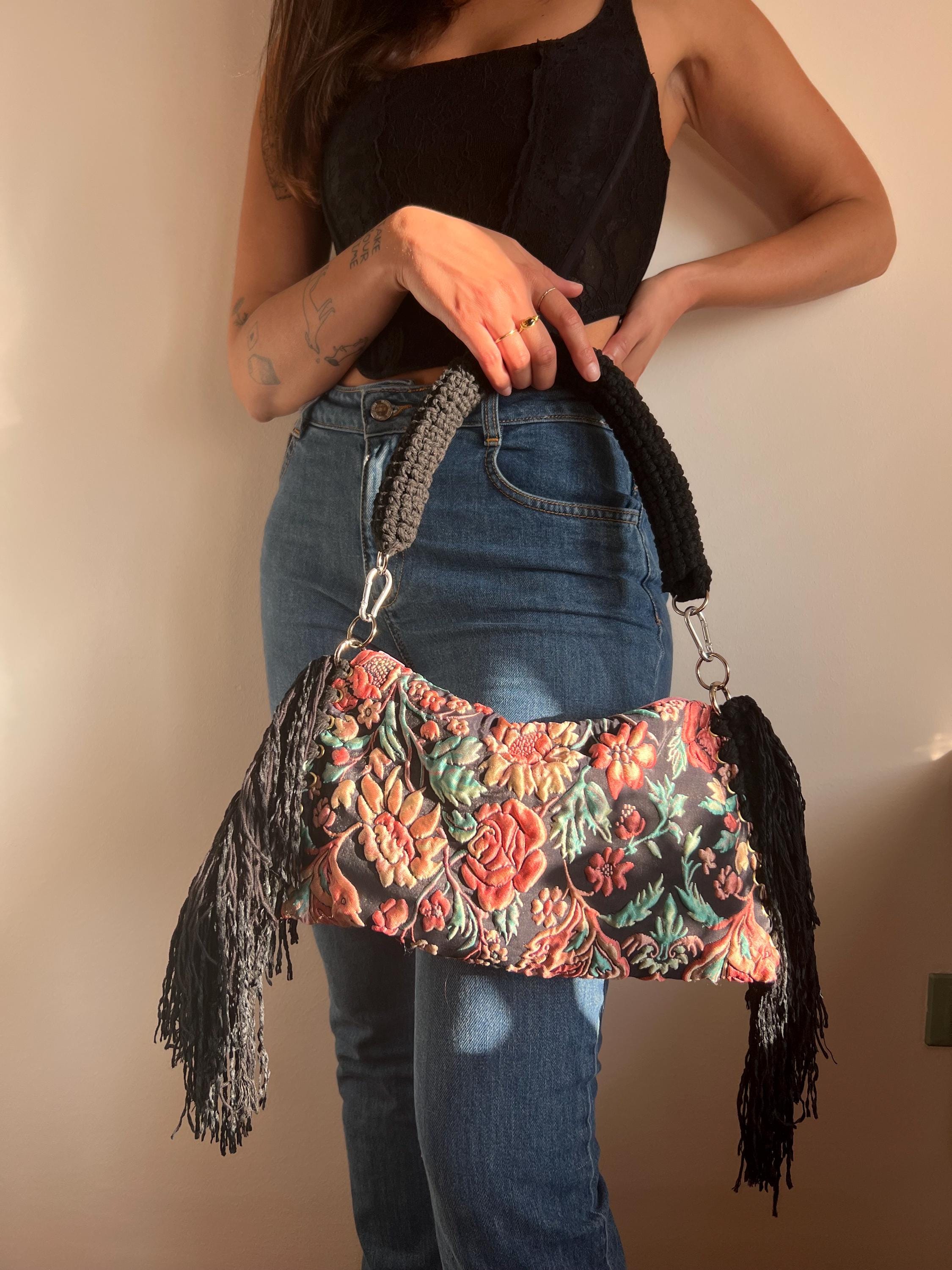 Side fringes in cotton thread and velvet that act as seams passing through the rings
