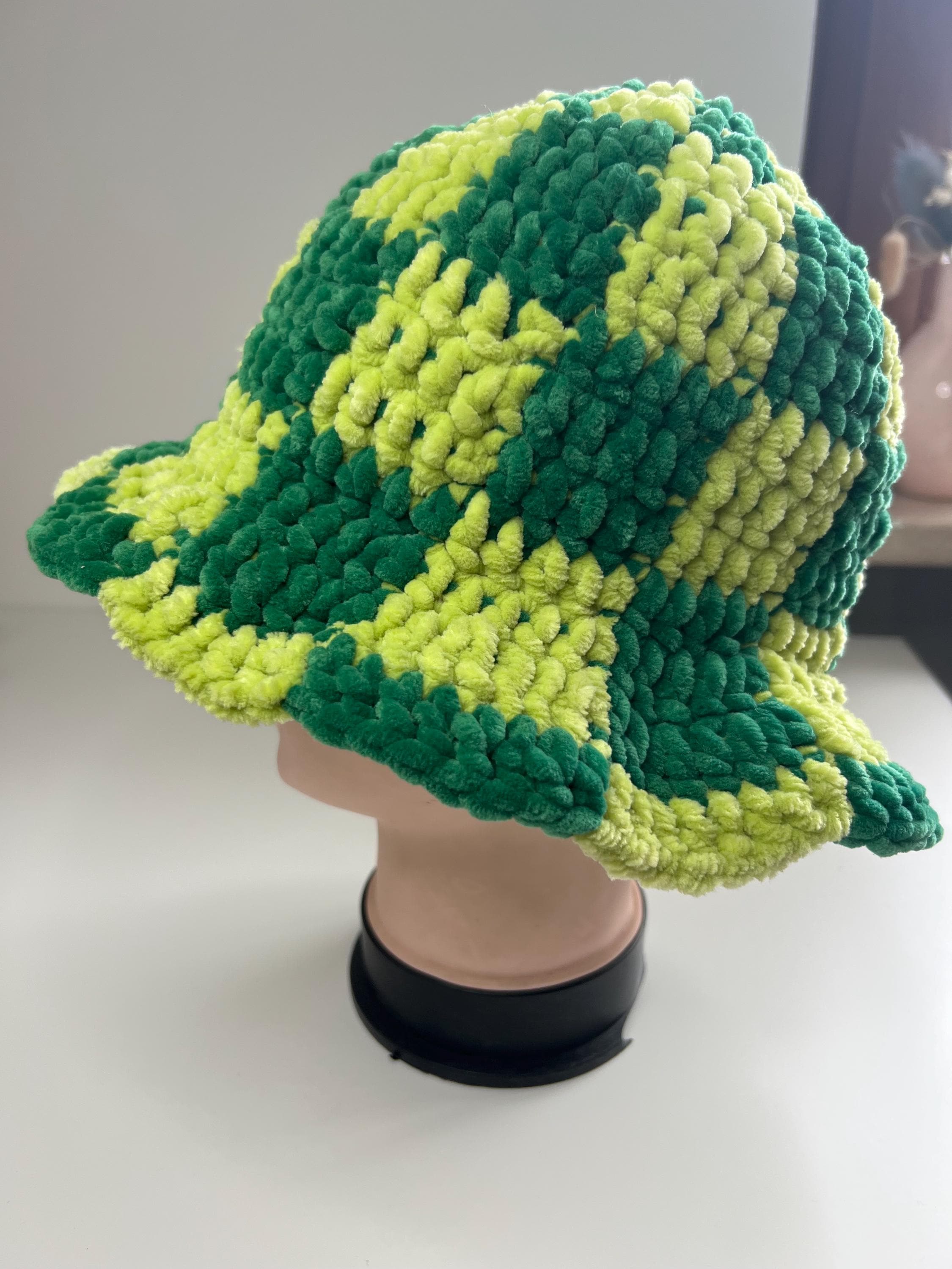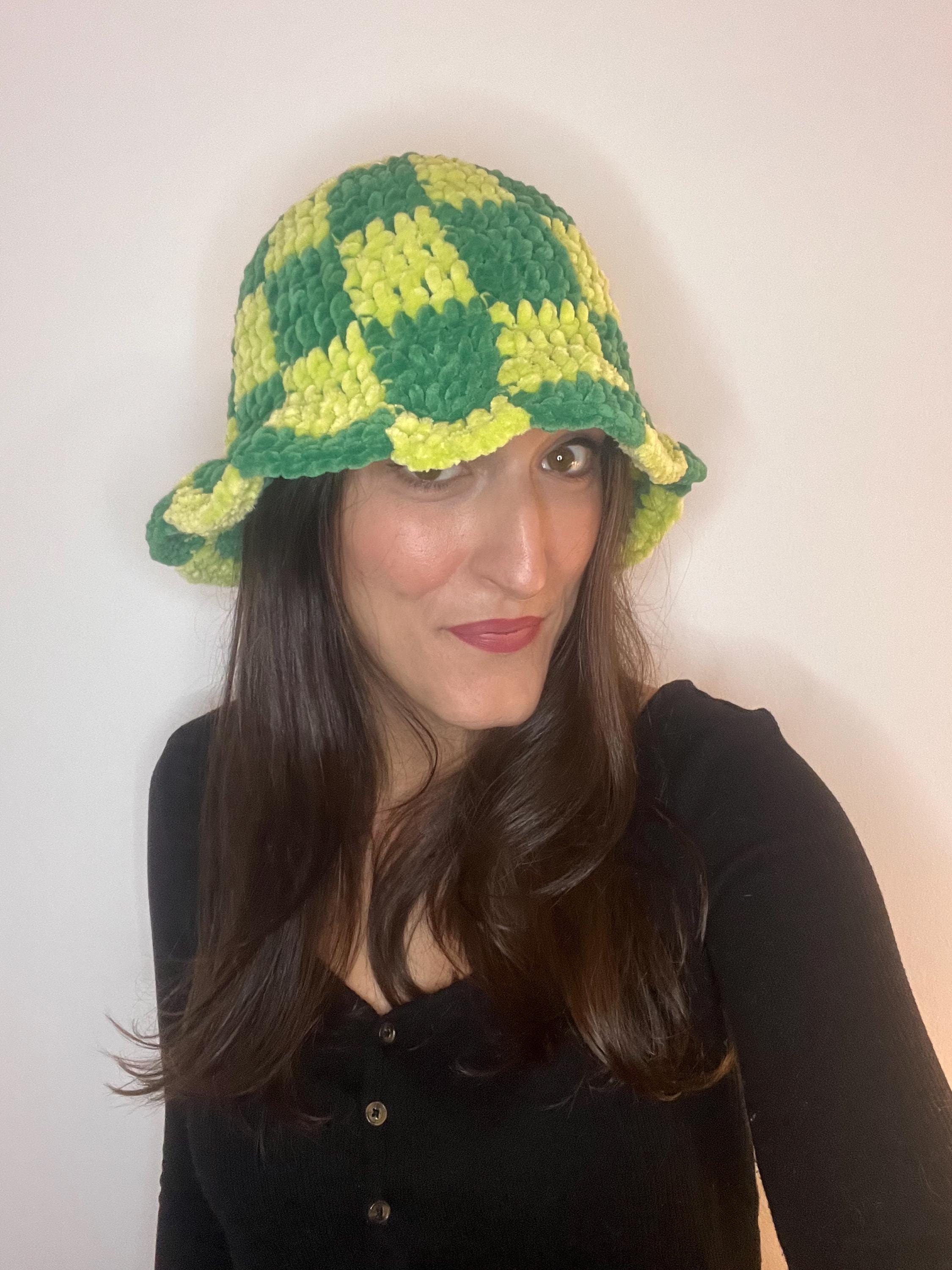 Beautiful, original and very soft crochet hat with a checked pattern made with light green and dark green chenille yarnFisherman modelOne size fits all