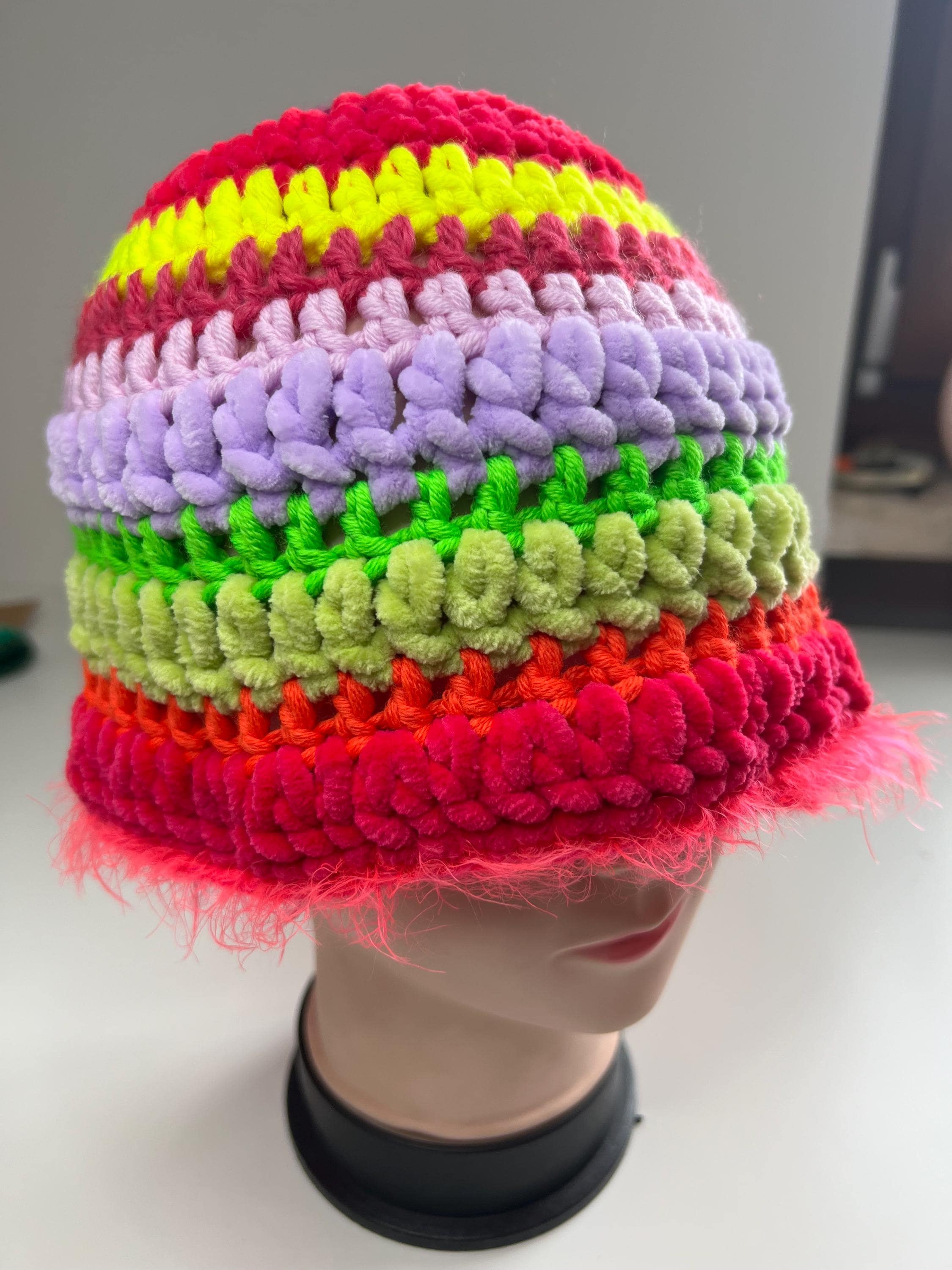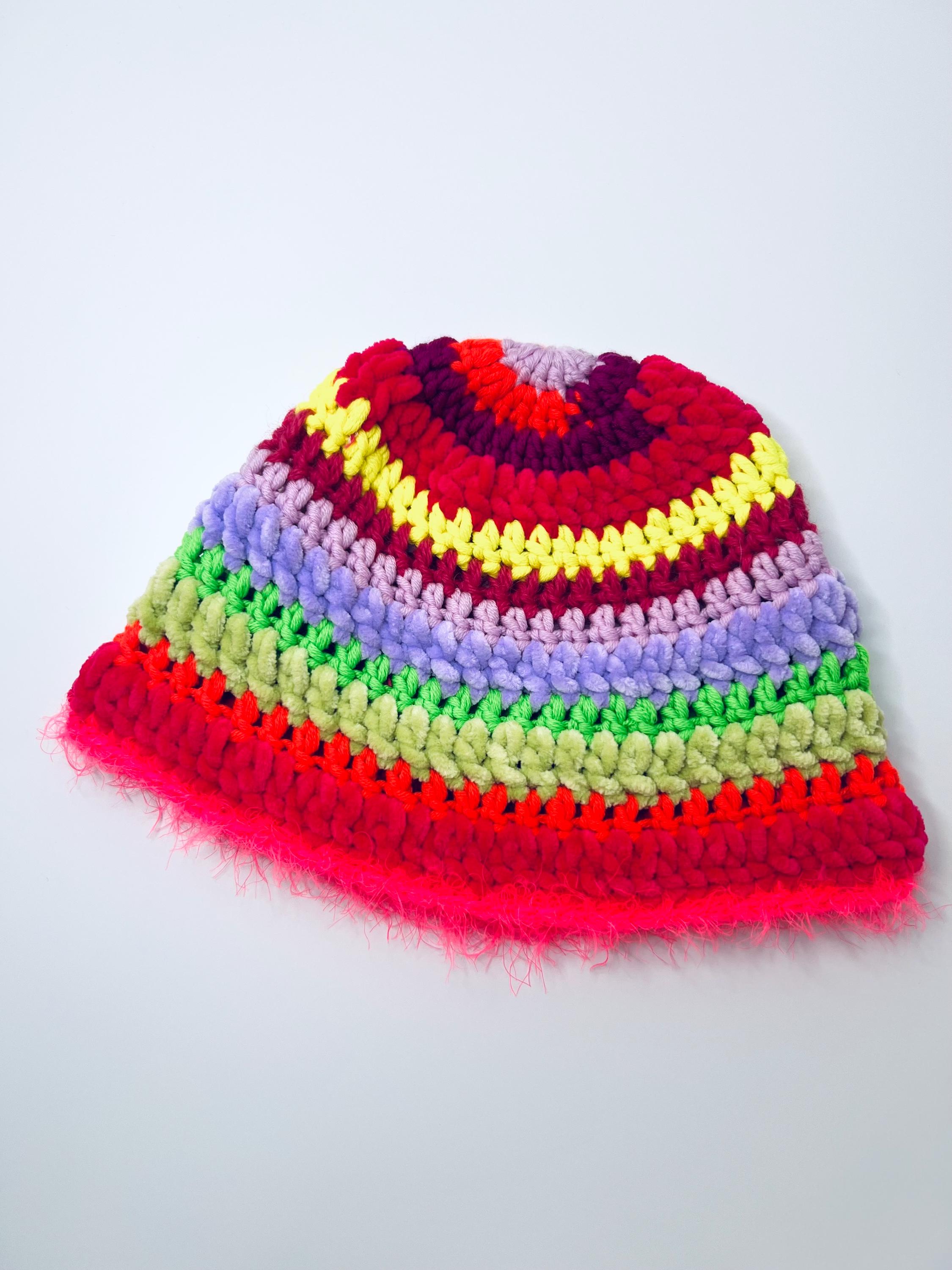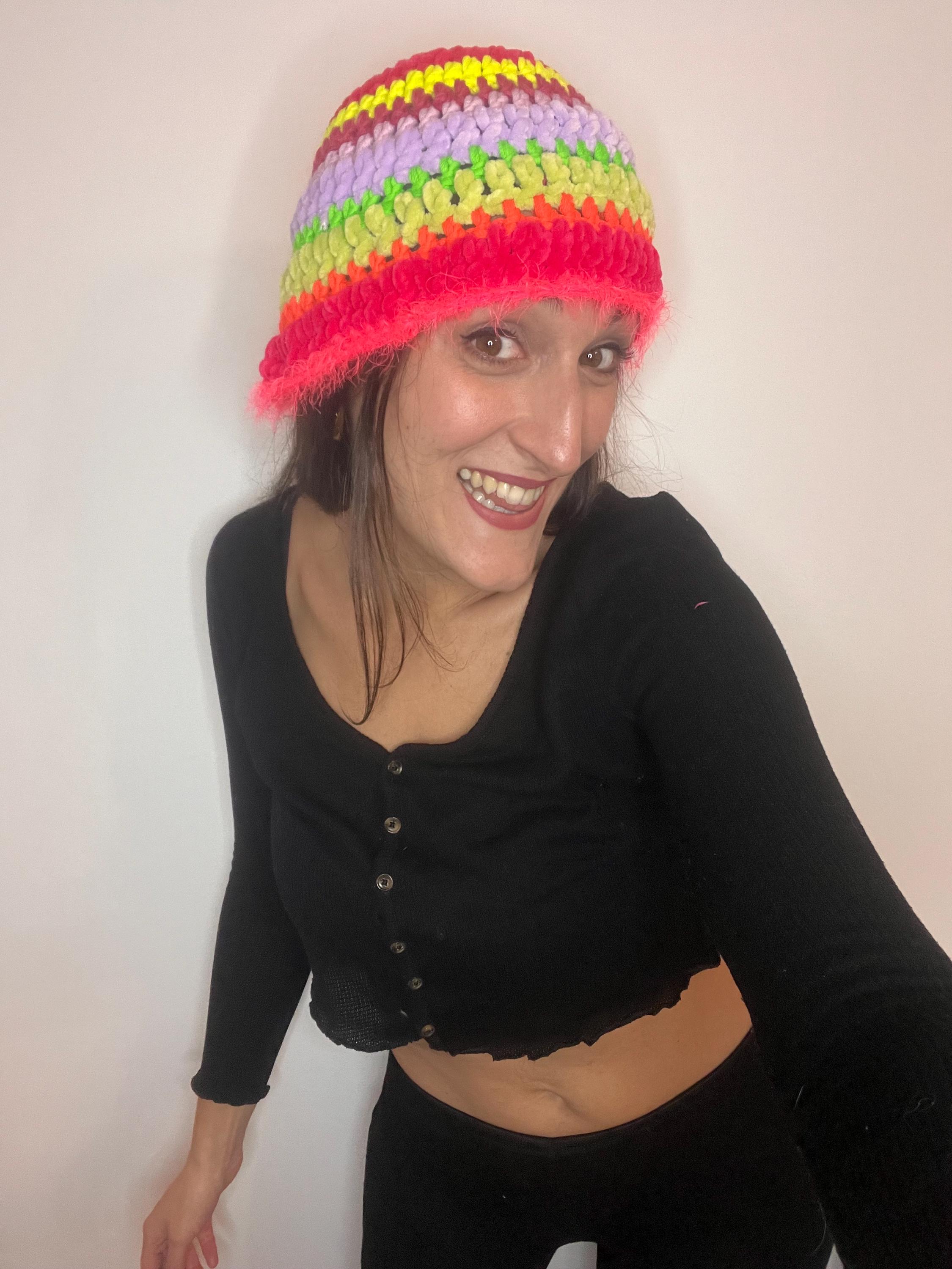 Colorful fisherman's hat crocheted with pure wool yarn mixed with chenille with a fringed edge in furry yarnfluorescent colors, multicolored from pink to yellow, green, orange, fuchsia and lilacSoft, warm and livelyOne piece and one size fits all