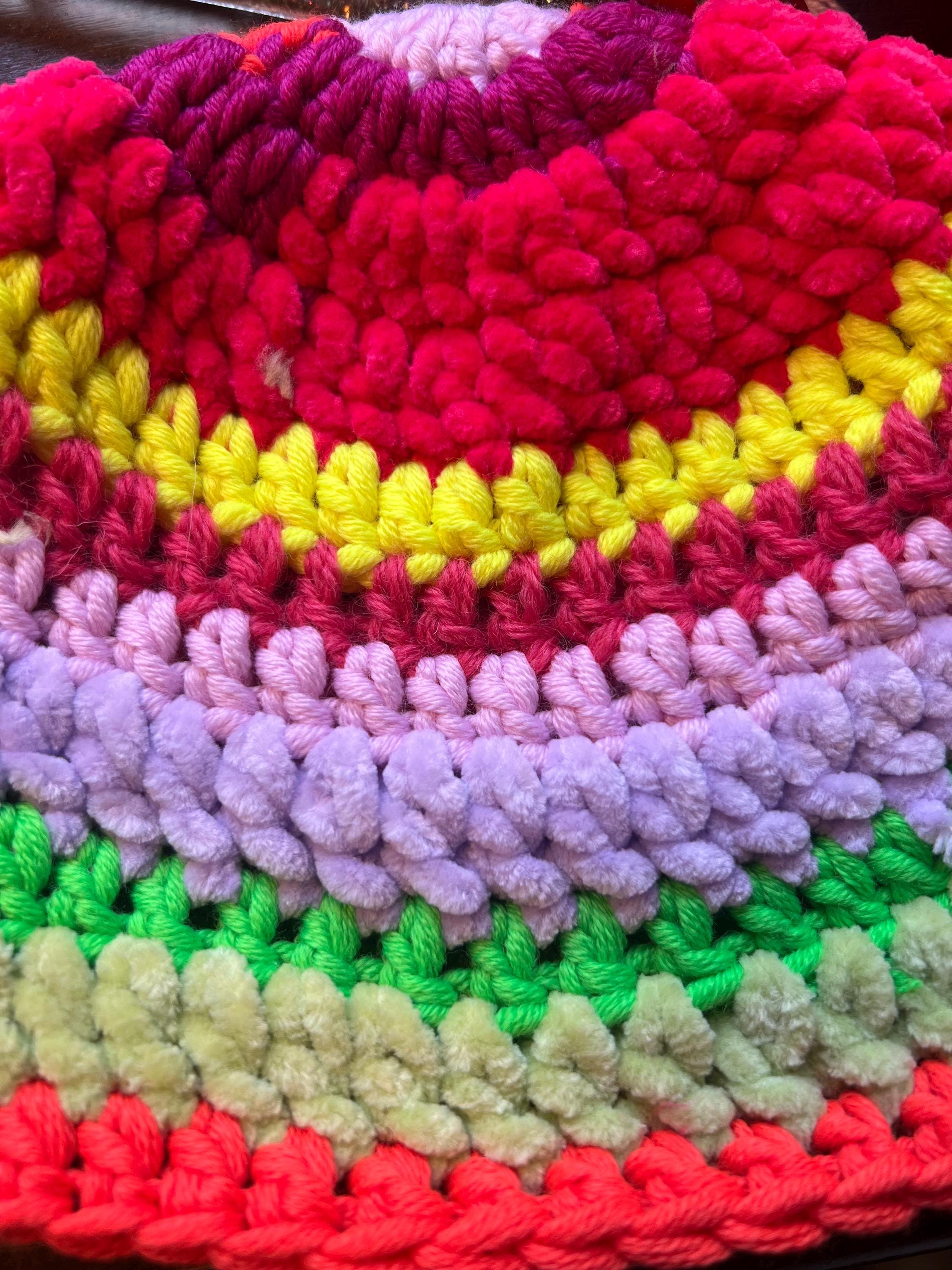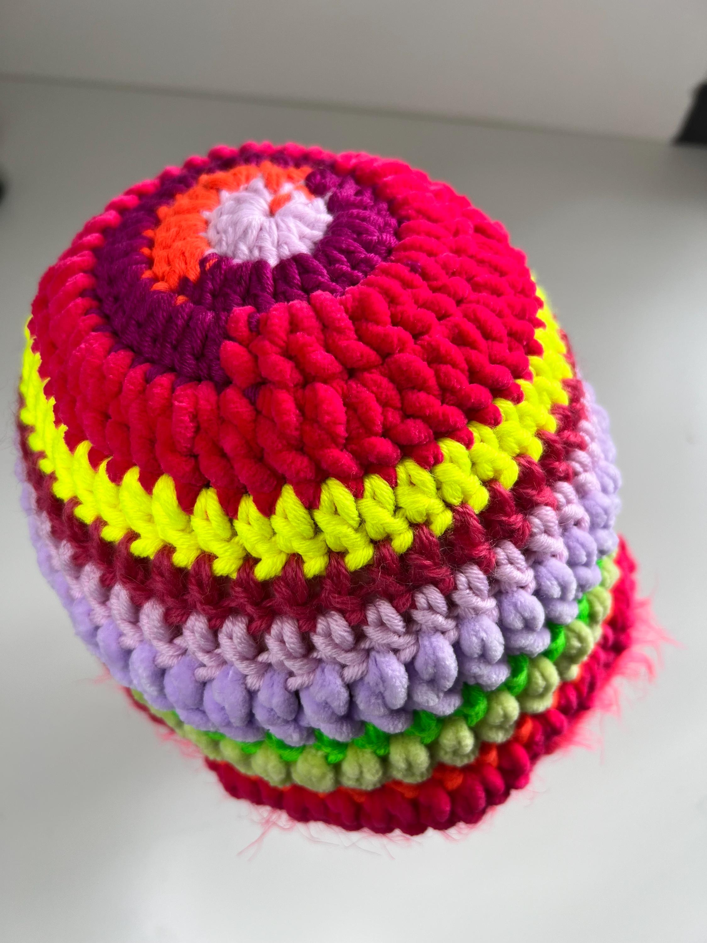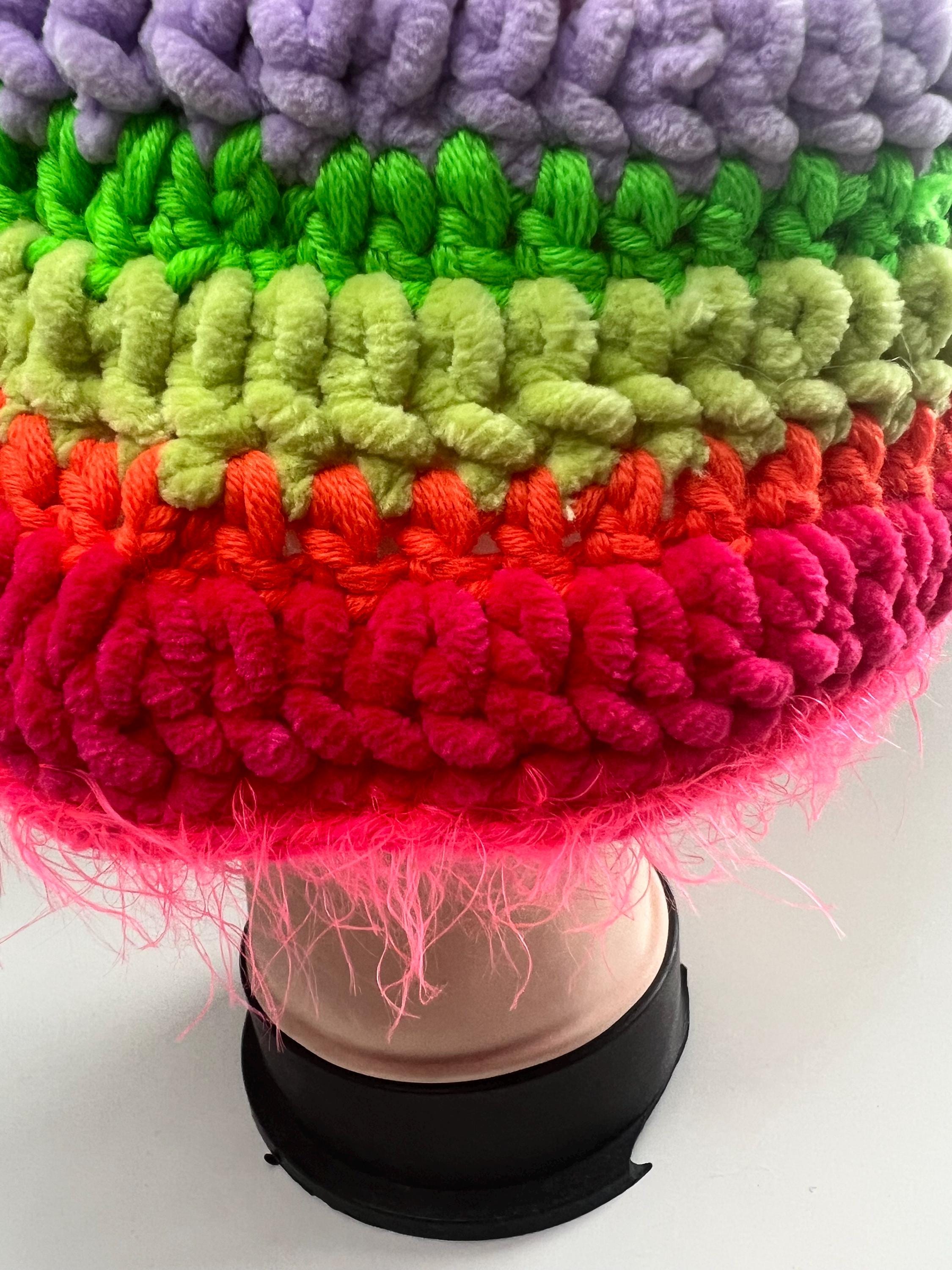 Colorful fisherman's hat crocheted with pure wool yarn mixed with chenille with a fringed edge in furry yarnfluorescent colors, multicolored from pink to yellow, green, orange, fuchsia and lilacSoft, warm and livelyOne piece and one size fits all